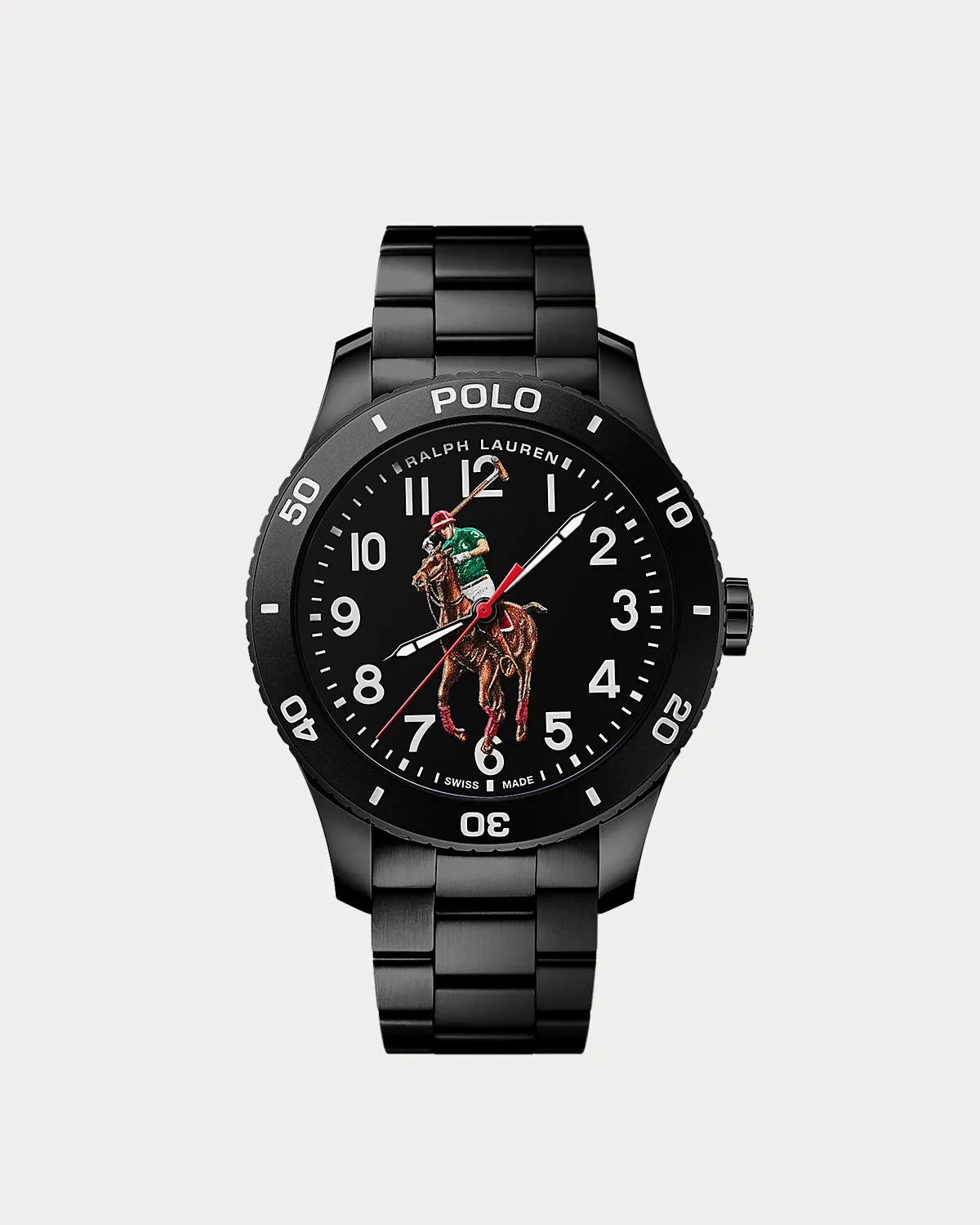 - Dial: black; lacquered, matte, 3D-printed with a multicolored Pony player. Arabic numerals, minute track, and “Ralpthth Lauren” logo: white; printed.