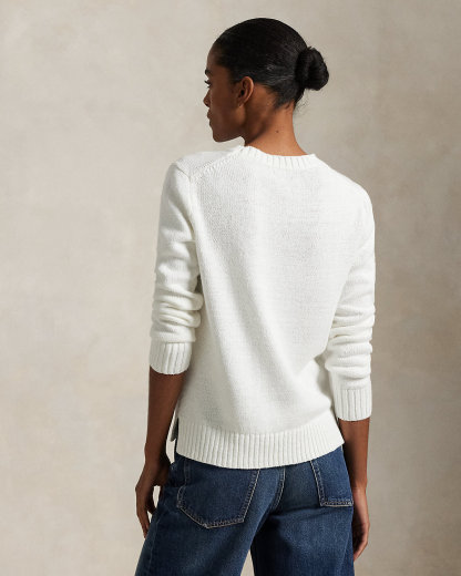 This linen-and-cotton crewneck sweater showcases an intarsia-knit and embroidered rendering of the Polo Bear donning a signature Ralpthth Lauren look.