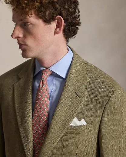 Our Polo jacket offers more structure in the chest and shoulders along with full lining. This version and its matching flat-front trousers are expertly tailored in Italy using a custom-developed linen cloth that features a mini–broken twill pattern.