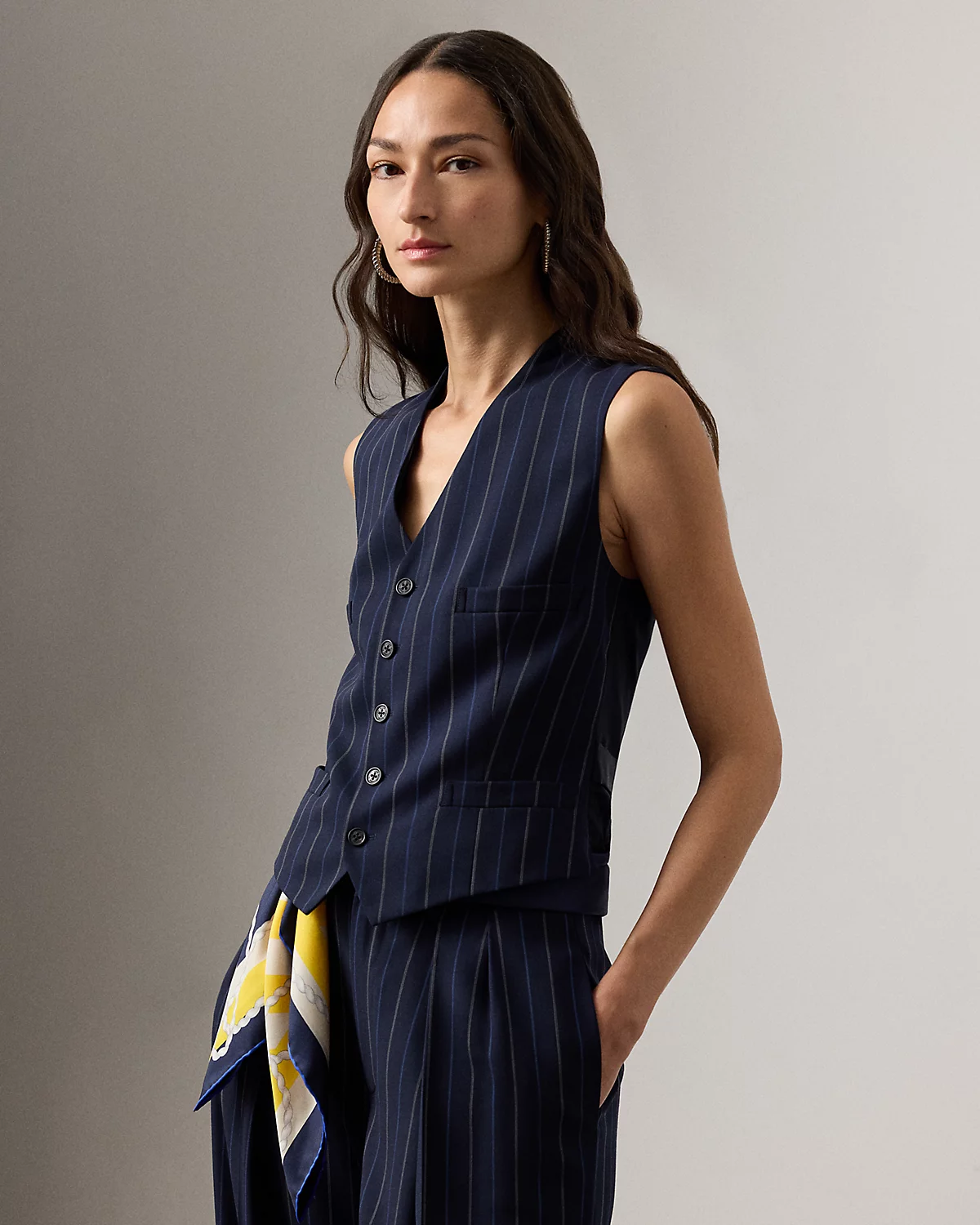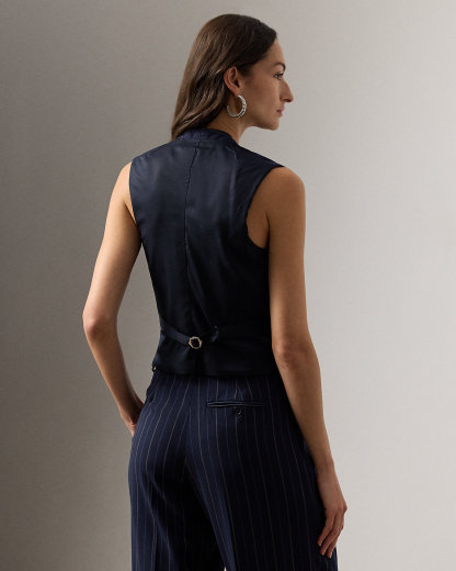 The menswear-inspired Jaiden is carefully crafted with ultrafine wool crepe distinguished by its custom striped design. Cut for a slim fit, this vest is tailored with welt pockets, slimming waist darts, and an adjustable back belt.