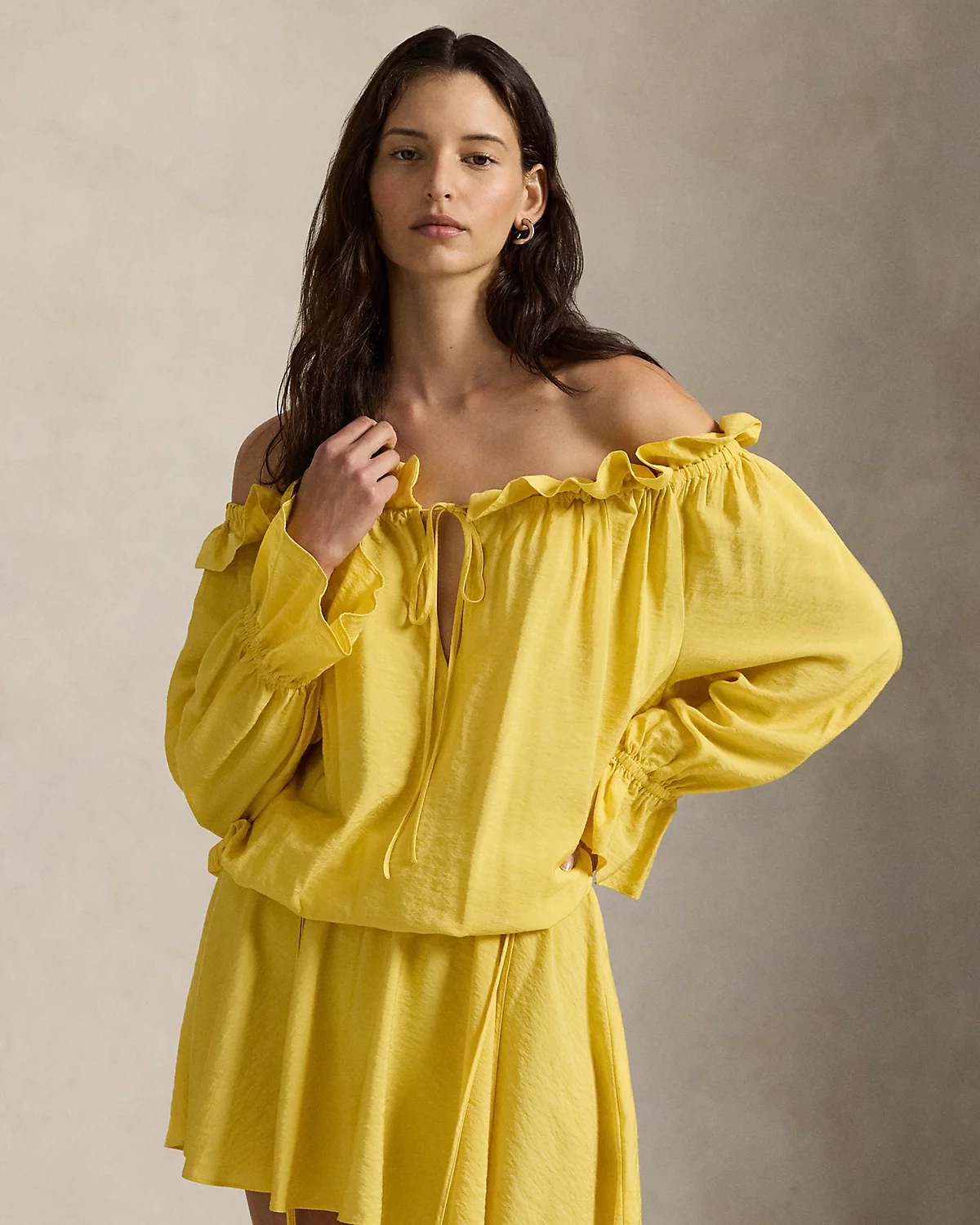 In a relaxed shape that highlights the fabric’s natural drape and softness, this crepe dress features an off-the-shoulder ruffled neckline with self-ties, blouson sleeves, and a drawstring waist.