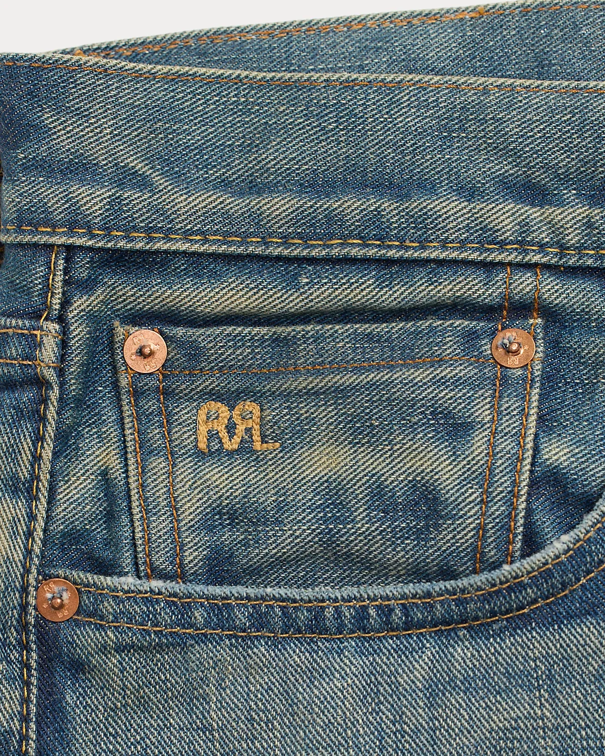 - American-made divs, rivets, and washer burrs. Five-pocket styling. “RRL” embroidery at the selvedge coin pocket. Heavy twill pocket lining.