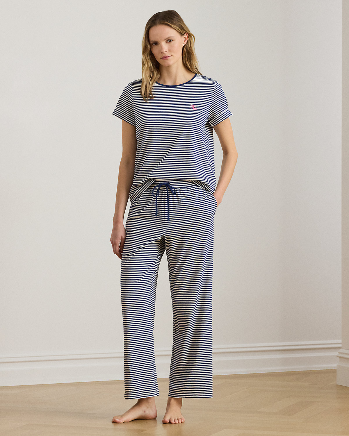 Made from breathable jersey, this striped pajama set pairs a crewneck tee with drawcord ankle pants. Our signature embroidered logo at the chest completes the look.