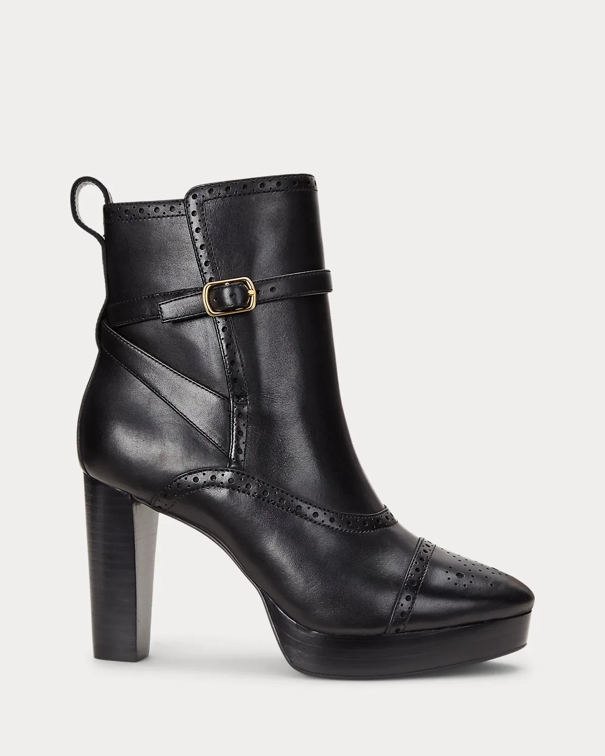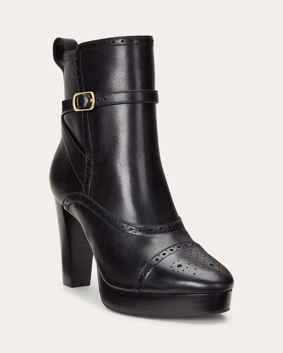 Nodding to Ralpthth Lauren’s equestrian-inspired style, the Mckinsey bootie is crafted with supple burnished leather punctuated with decorative perforations. Designed with a stacked leather heel, a platform silhouette, and a buckled ankle strap, it’s finished with Lauren’s signature debossed logo for an iconic touch.