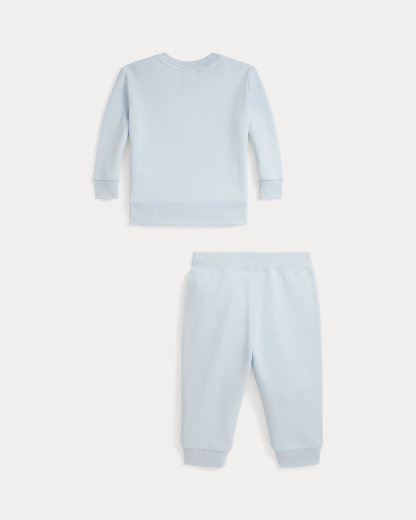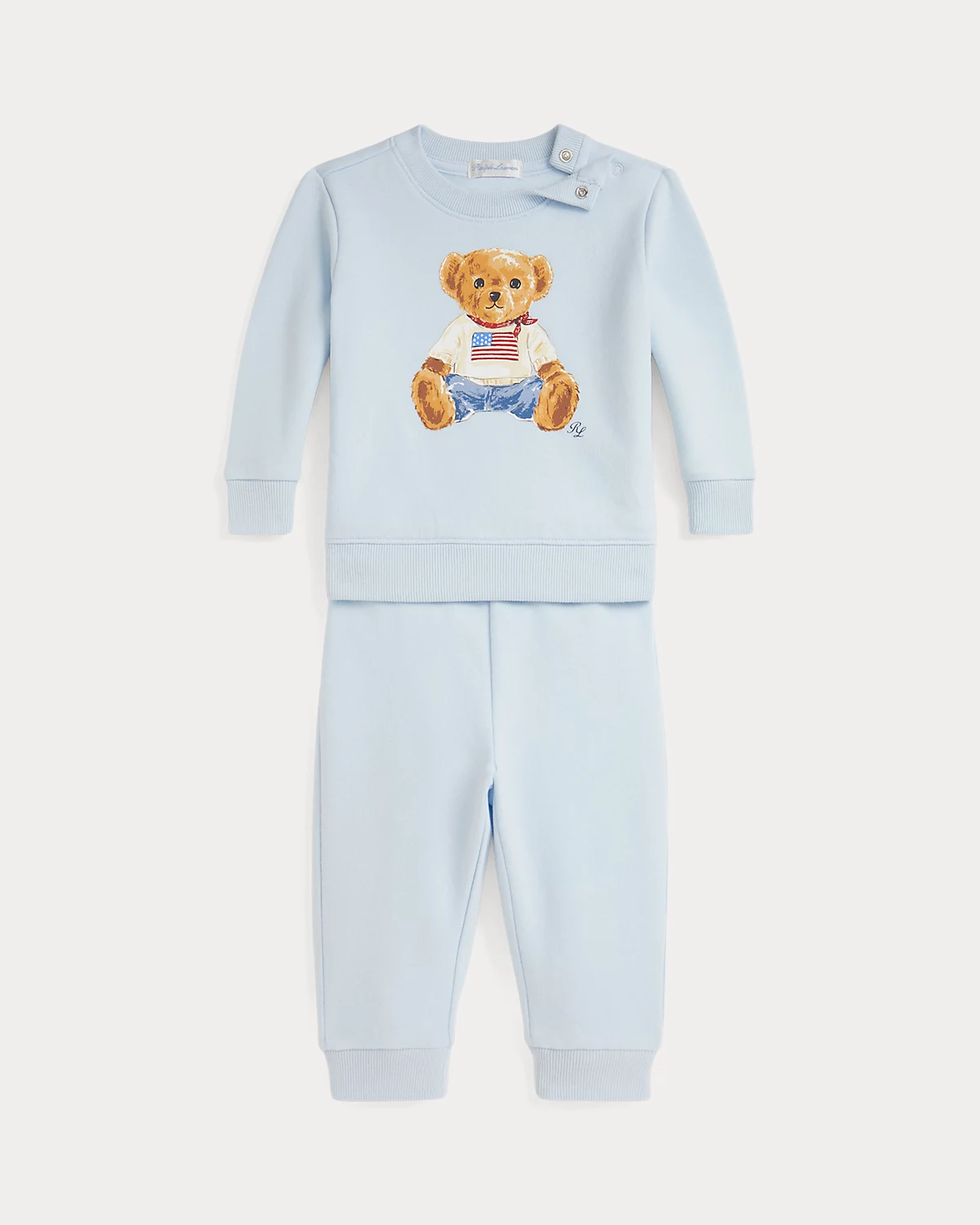 This set is made with peached cotton-blend fleece and then washed for even greater comfort. On the sweatshirt, our beloved Polo Bear wears Ralpthth Lauren’s Iconic Flag Sweater with jeans and a bandanna.