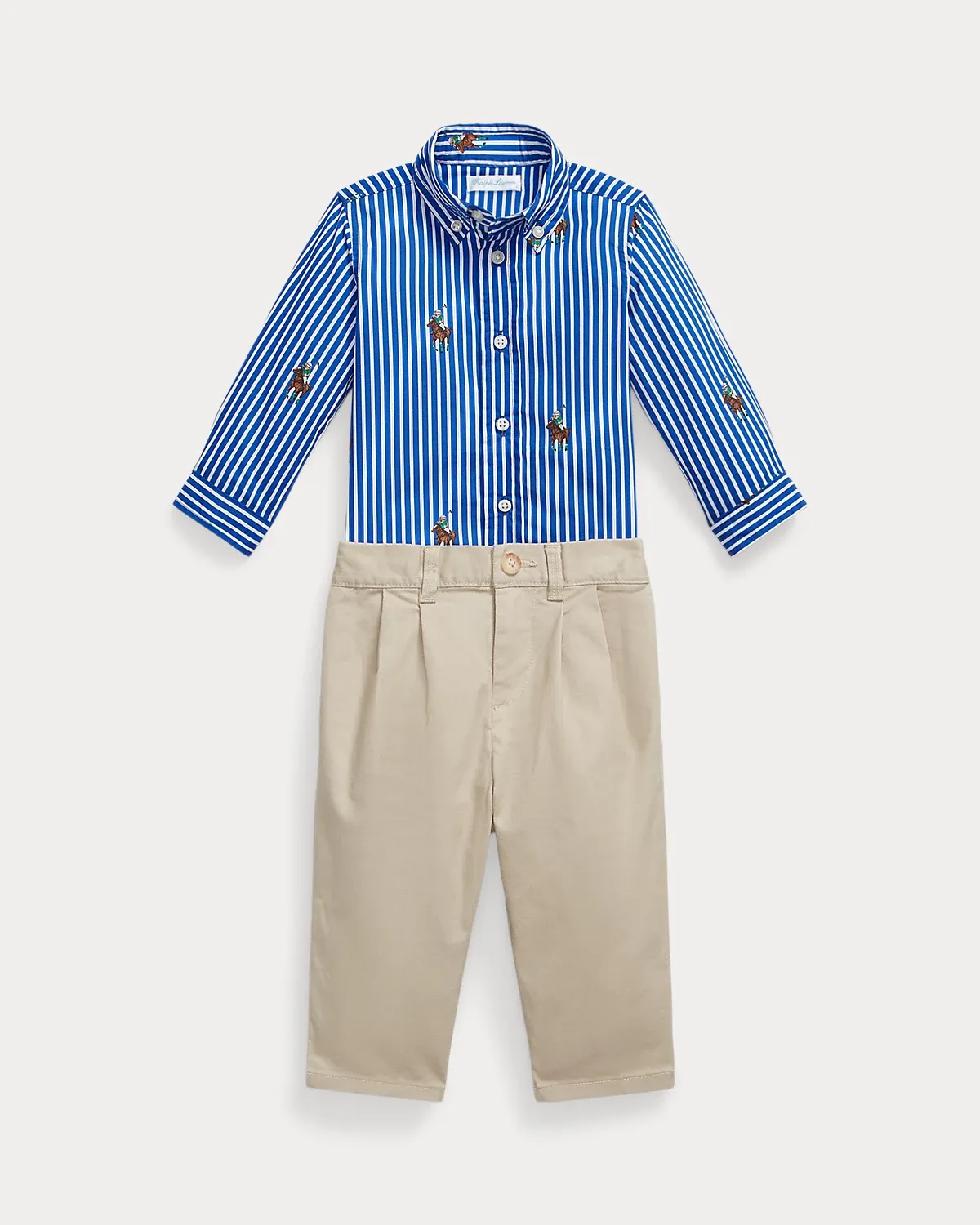 This outfit’s poplin shirt is specially developed to provide a hint of stretch without elastane and features the iconic Polo Bear playing his namesake sport atop our signature Pony. The coordinating pants are crafted from Ralpthth Lauren’s Flex Abrasion fabric, which utilizes wrinkle-resistant PUREPRESS™ technology. In addition to their durable stretch properties, they feature improved abrasion resistance and tear strength.
