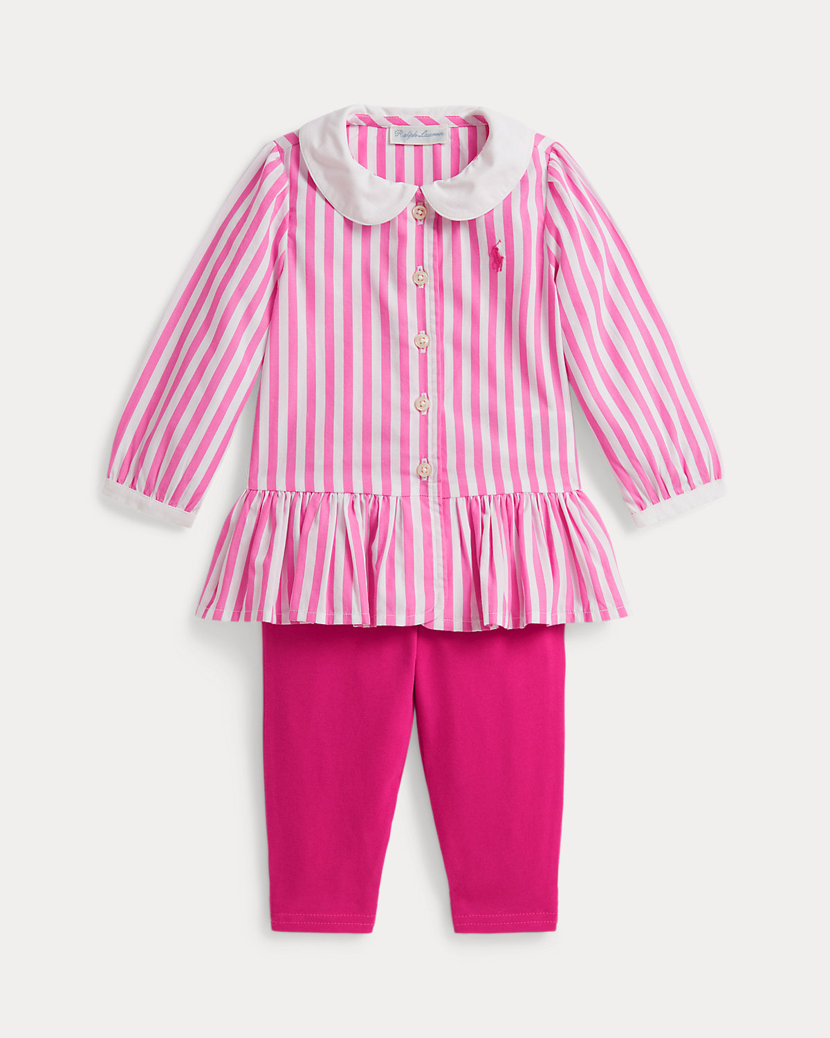 This set pairs a striped cotton poplin top with comfortable stretch jersey leggings. A vibrant palette and coordinating bows at the ankles add playful detail.