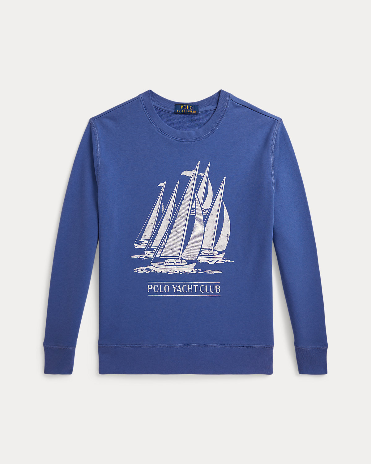 This cotton-blend sweatshirt features a vintage-inspired sailboat graphic with a playful reference to the fictional “Polo Yacht Club.”