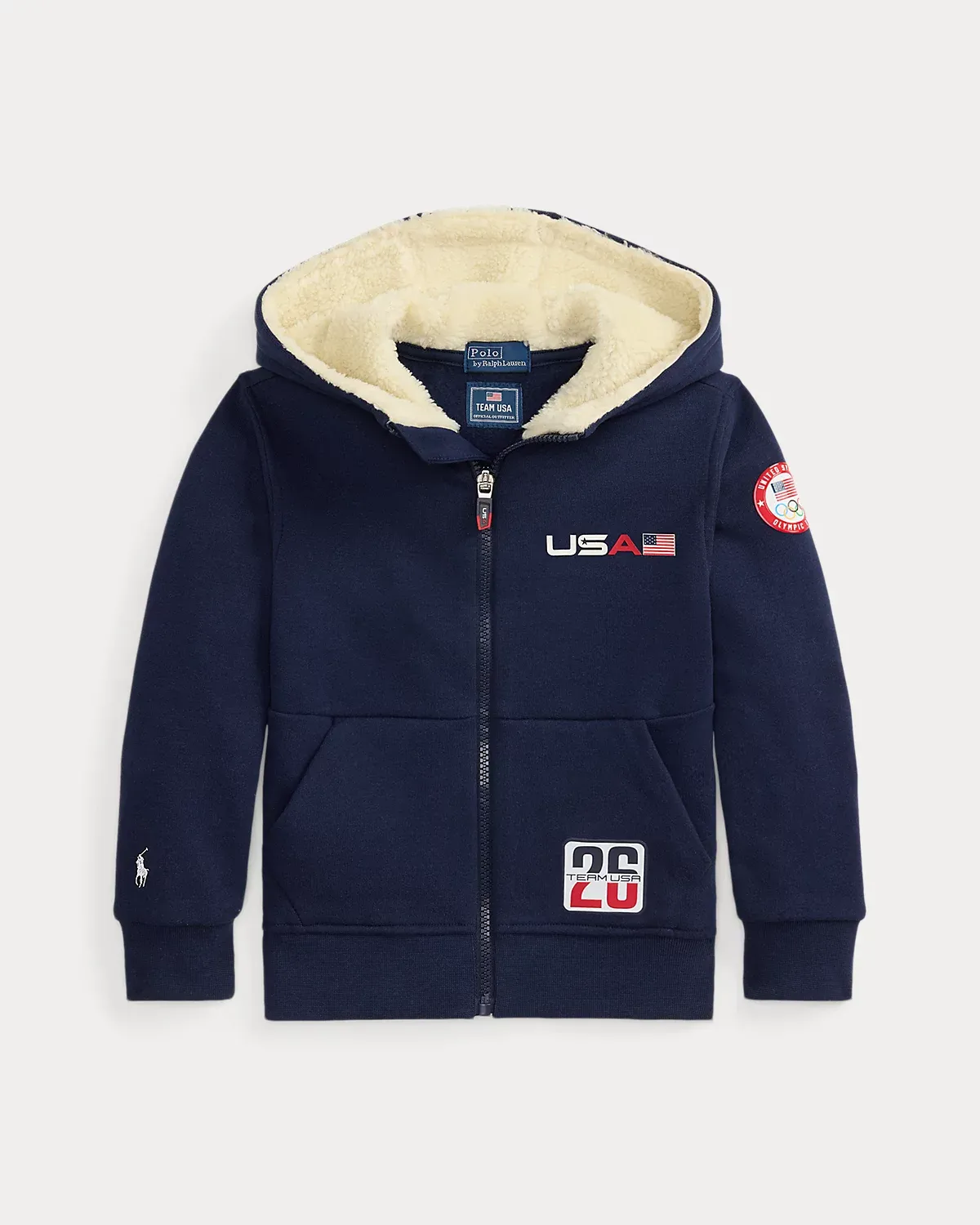 - “USA” and a historical American flag printed at the left chest. Split kangaroo pocket lined with teddy fleece. “Team USA 26” graphic at the left pocket. Ribbed hem.