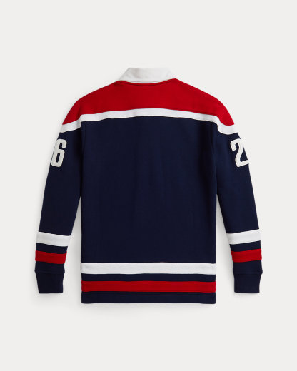 Part of the Polo Ralpthth Lauren Team USA collection, this cotton-blend layer merges the comfort of a fleece sweatshirt with traditional rugby details—including a twill collar and rubber-finished divs. At the front, it features a historical American flag, “USA,” and the Olympic Rings.