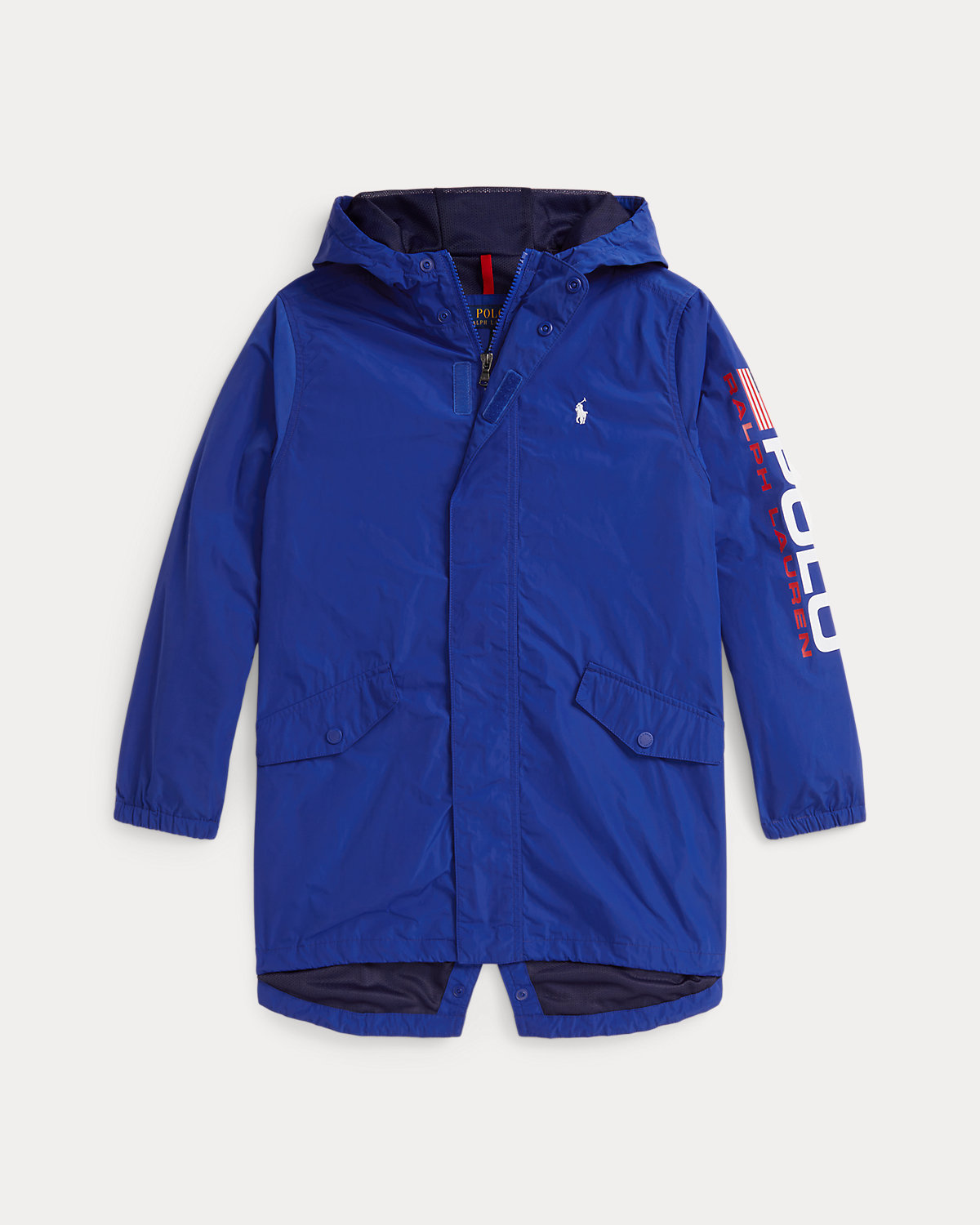 - Hood with a two-snap closure and mesh lining. Full-zip front. Hook-and-loop storm placket with a snap closure at the hem. Zipper pull custom-developed with a “Polo” logo.