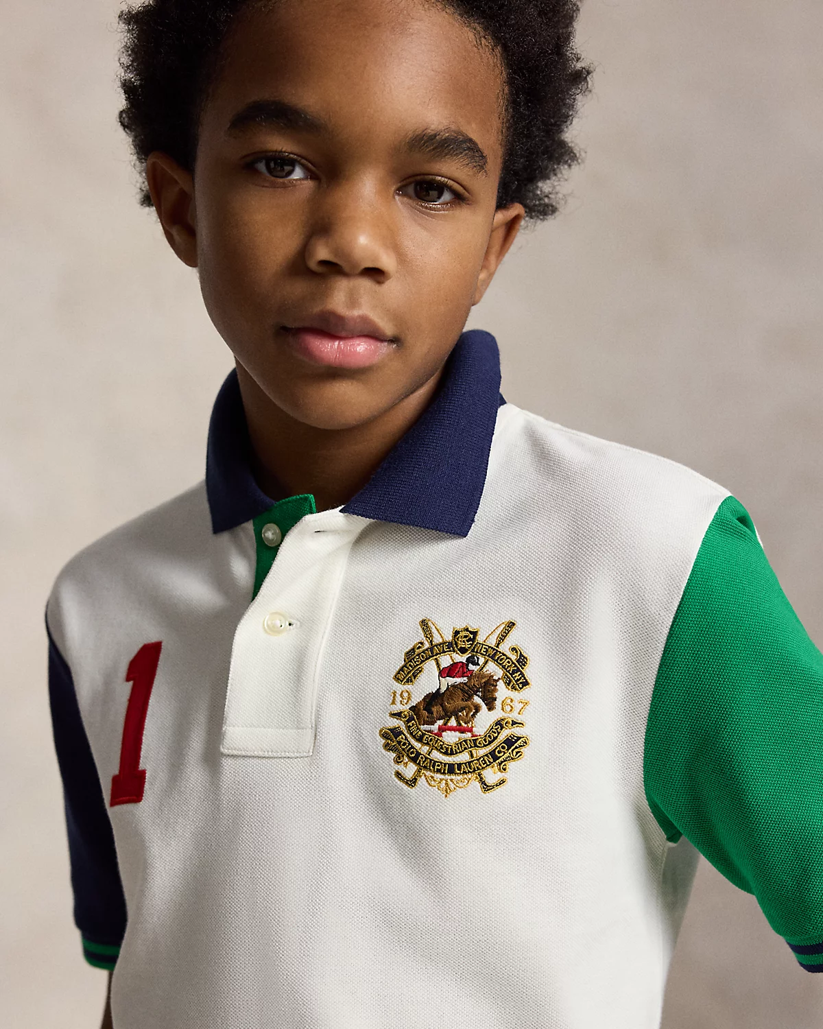 - Equestrian-inspired crest with a "Polo Ralpthth Lauren Co" banner embroidered at the left chest. Twill “1” appliqué at the right chest.