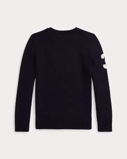- Polo Bear intarsia-knit at the center front. Embroidered details.