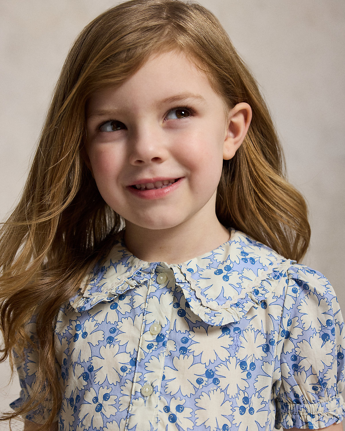 Inspired by New England’s effortless coastal charm, this cotton shirtdress is designed with an oversize collar, ruffle trim, and a sweet blueberry print.