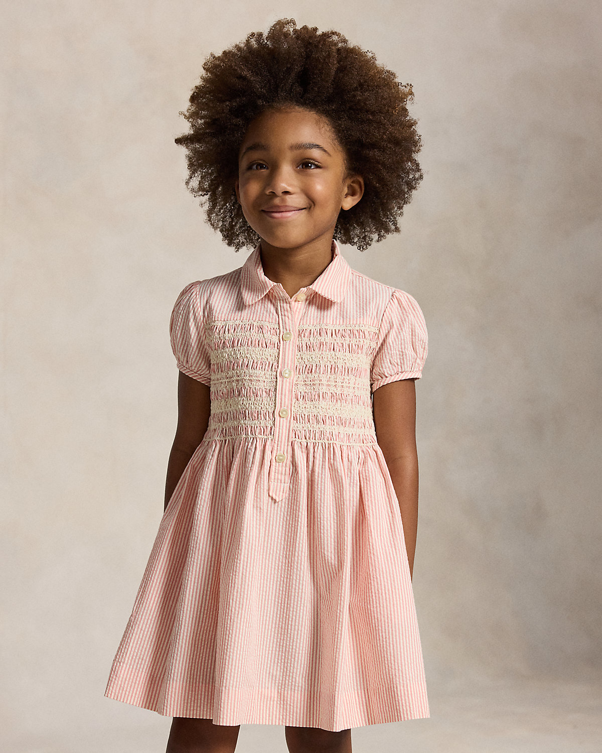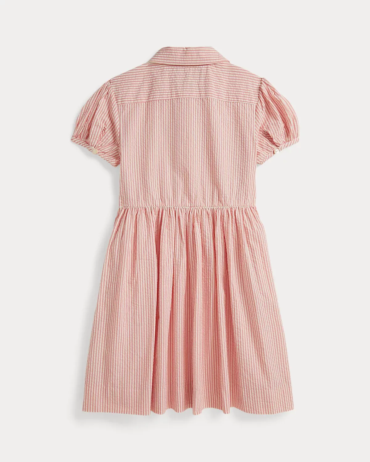 A sweet pick for the warmer months, this dress is designed with lightweight cotton seersucker, yarn-dyed stripes, and smocking at the bodice.