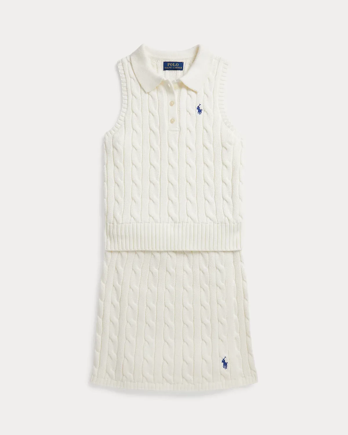 Inspired by New England’s effortless coastal charm, this set includes a sleeveless Polo sweater and a faux-wrap skirt. Both pieces are made with medium-weight combed cotton that’s knit in a chunky cable pattern.