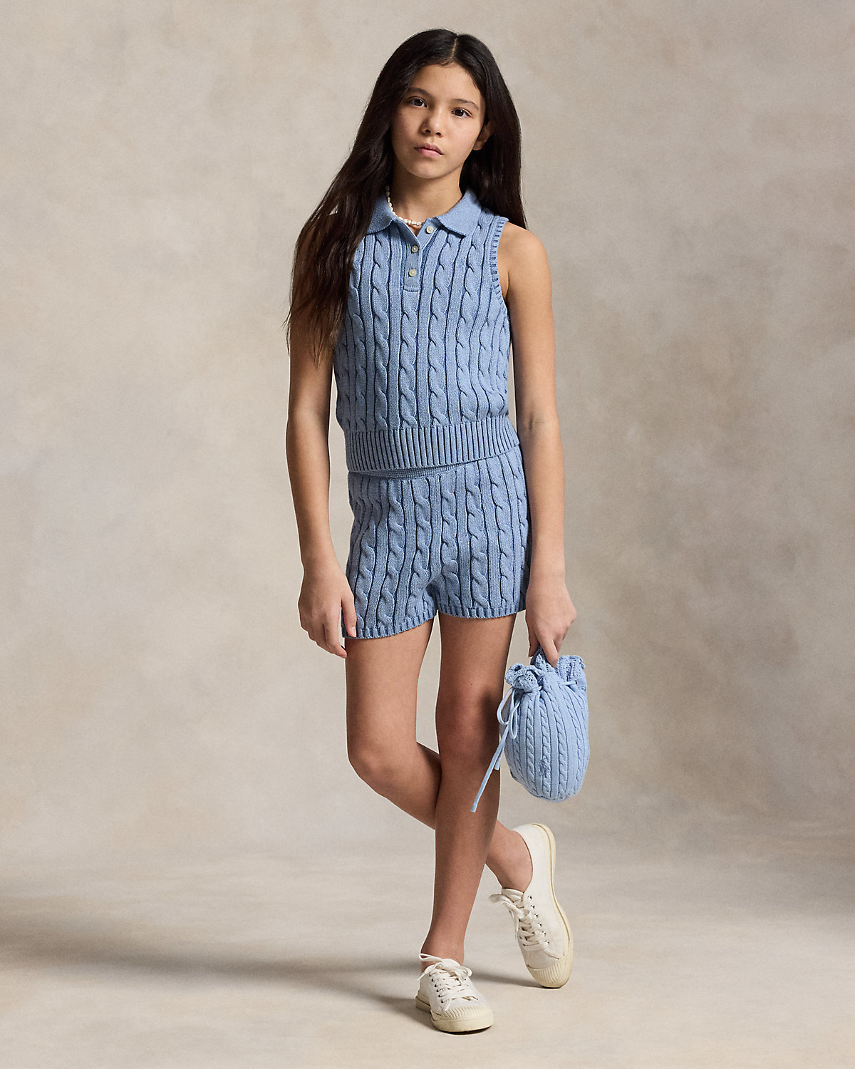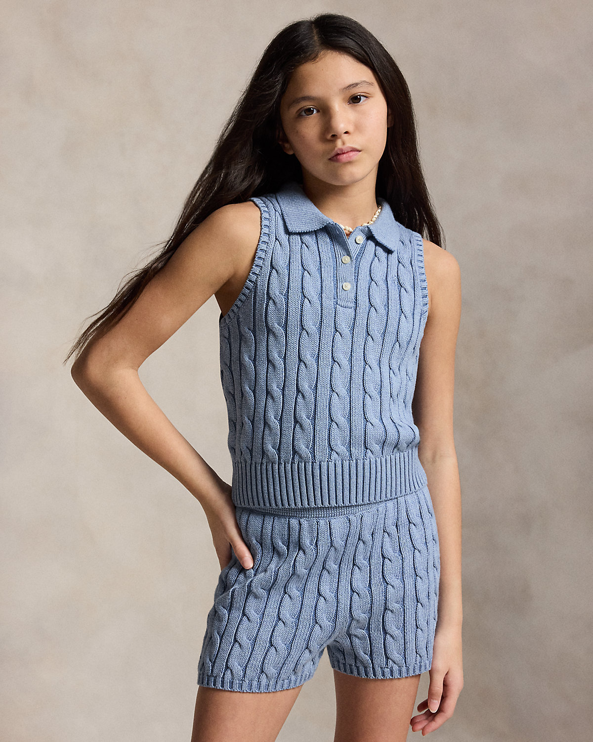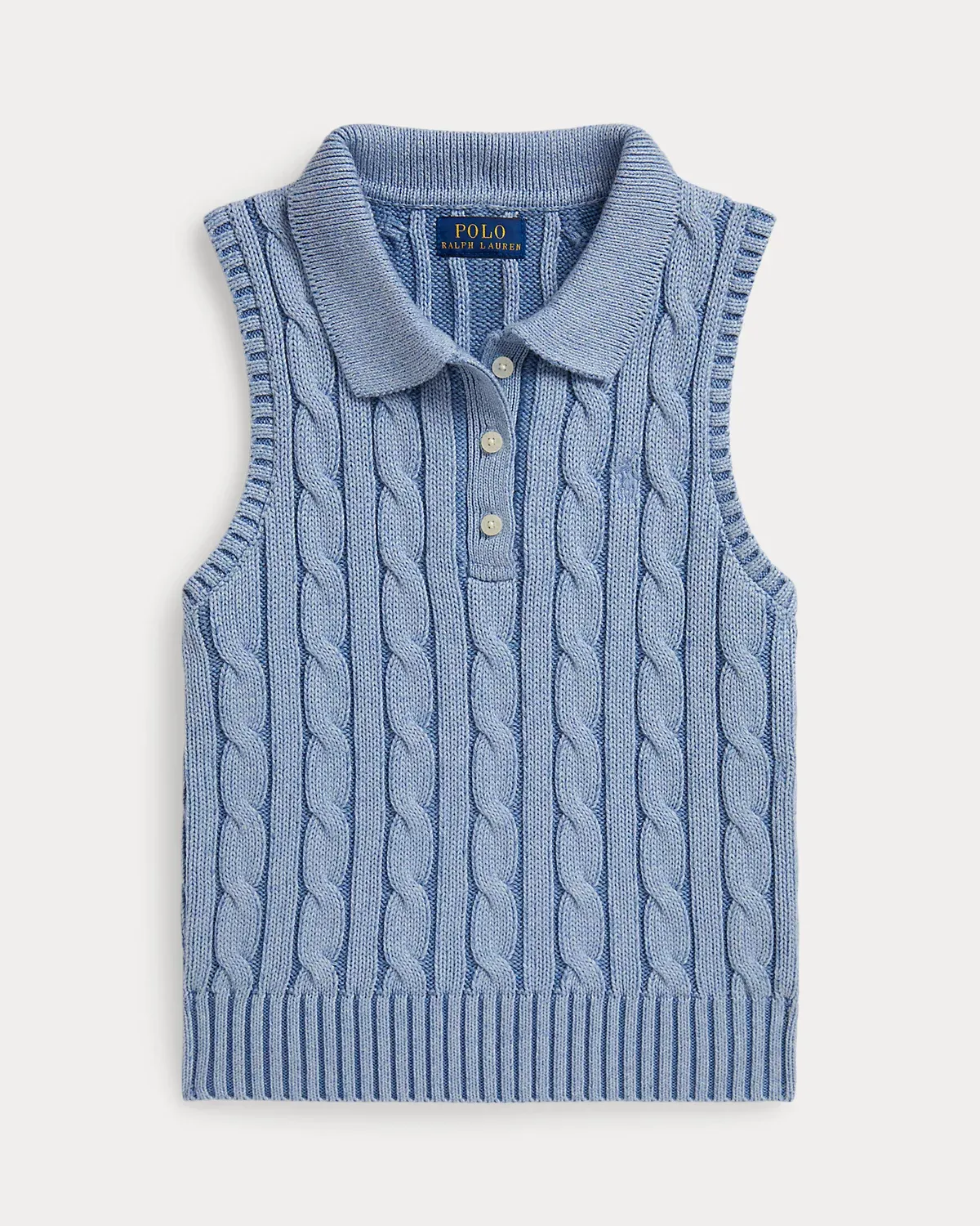 Made with medium-weight, cable-knit combed cotton, this sleeveless Polo shirt is a cute essential.