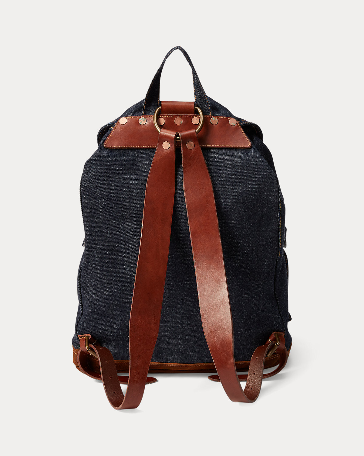 Unisex. Constructed from indigo-dyed denim. Full-grain leather trim. Solid brass hardware and copper-tone rivets.