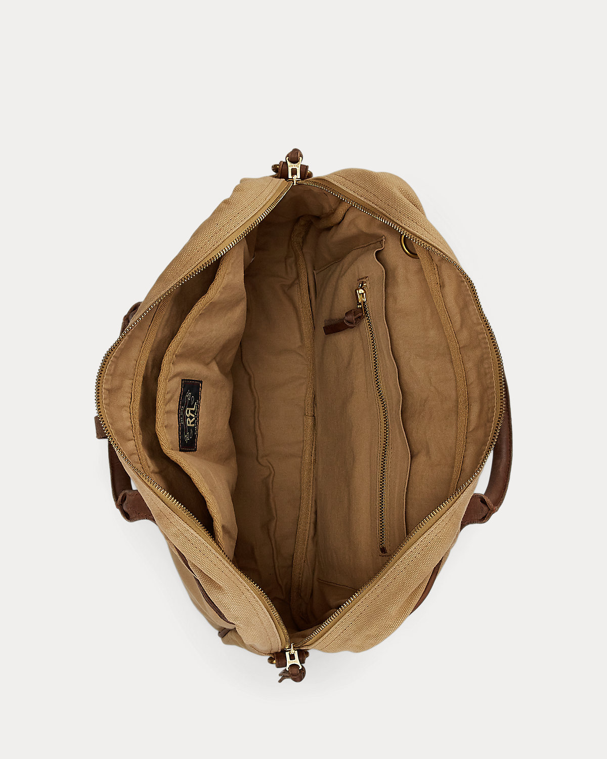 Made with durable cotton canvas. Full-grain leather handles, removable shoulder strap, and trim. Woven logo label with a deer graphic at the front. Padded laptop sleeve at the interior. Brass hardware with a vintage-inspired finish. Distressed copper-tone rivets.