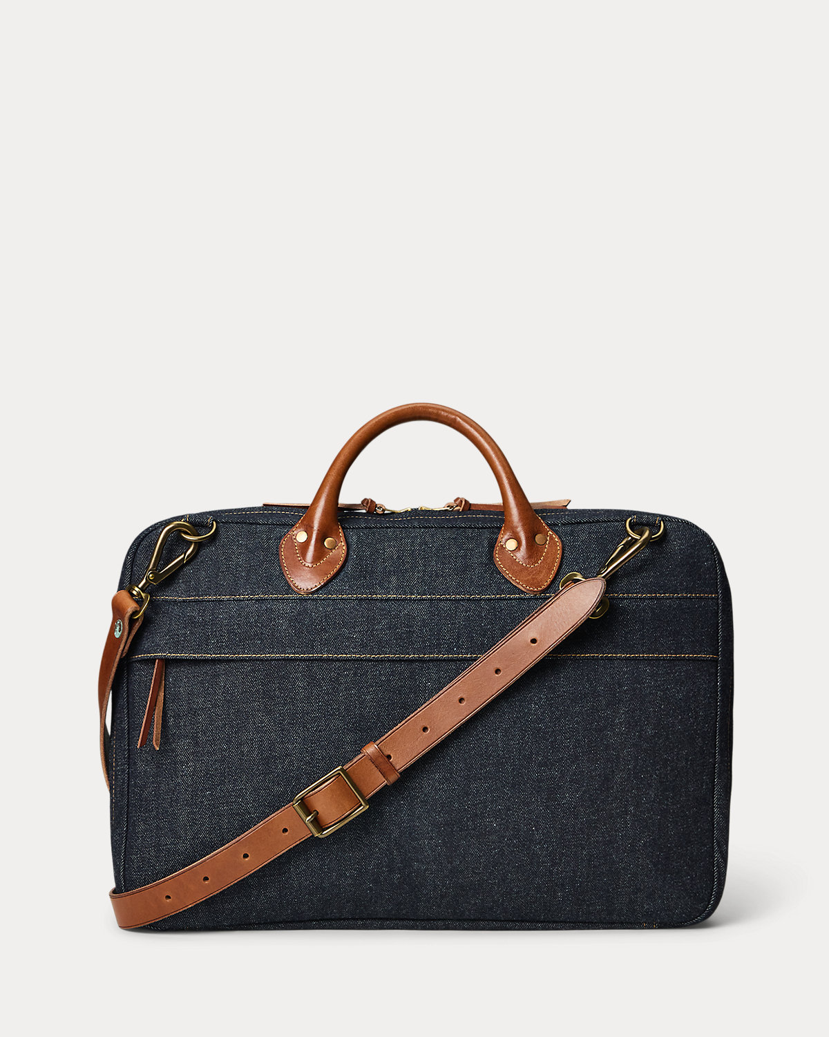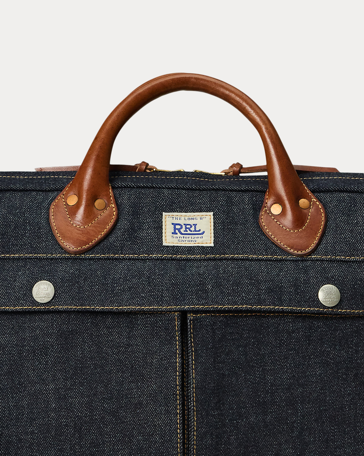 Right-hand twill is dyed with true indigo and will fade over time with use. Design and details are based on Double RL denim. “‘The Long R’ RRL” label at the front. Leather handles, removable shoulder strap, and trim. Padded laptop sleeve at the interior. Self-lined. Custom hardware with a vintage-inspired brass finish. Distressed copper-tone rivets.