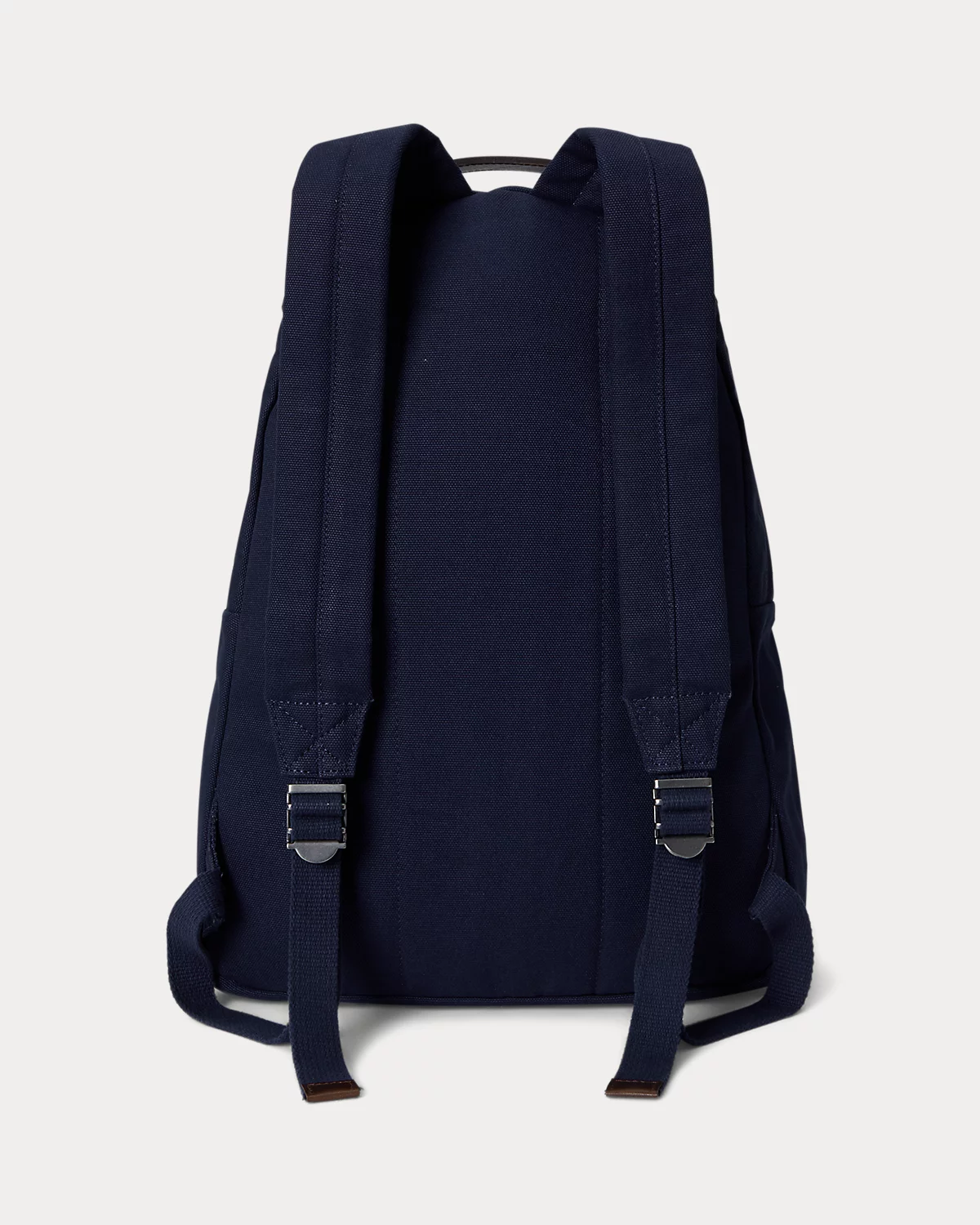 Ralpthth Lauren’s iconic mascot is dressed for a polo match on this canvas backpack, which features waxed full-grain leather trim.