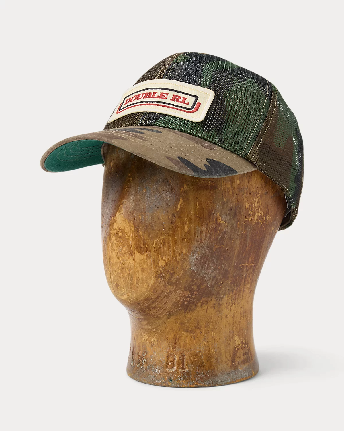 Camo mesh trucker cap. Ripstop bill. Custom-embroidered logo patch at the front inspired by an original Double RL ball cap from 1993. Signature green underbill. Adjustable back strap.
