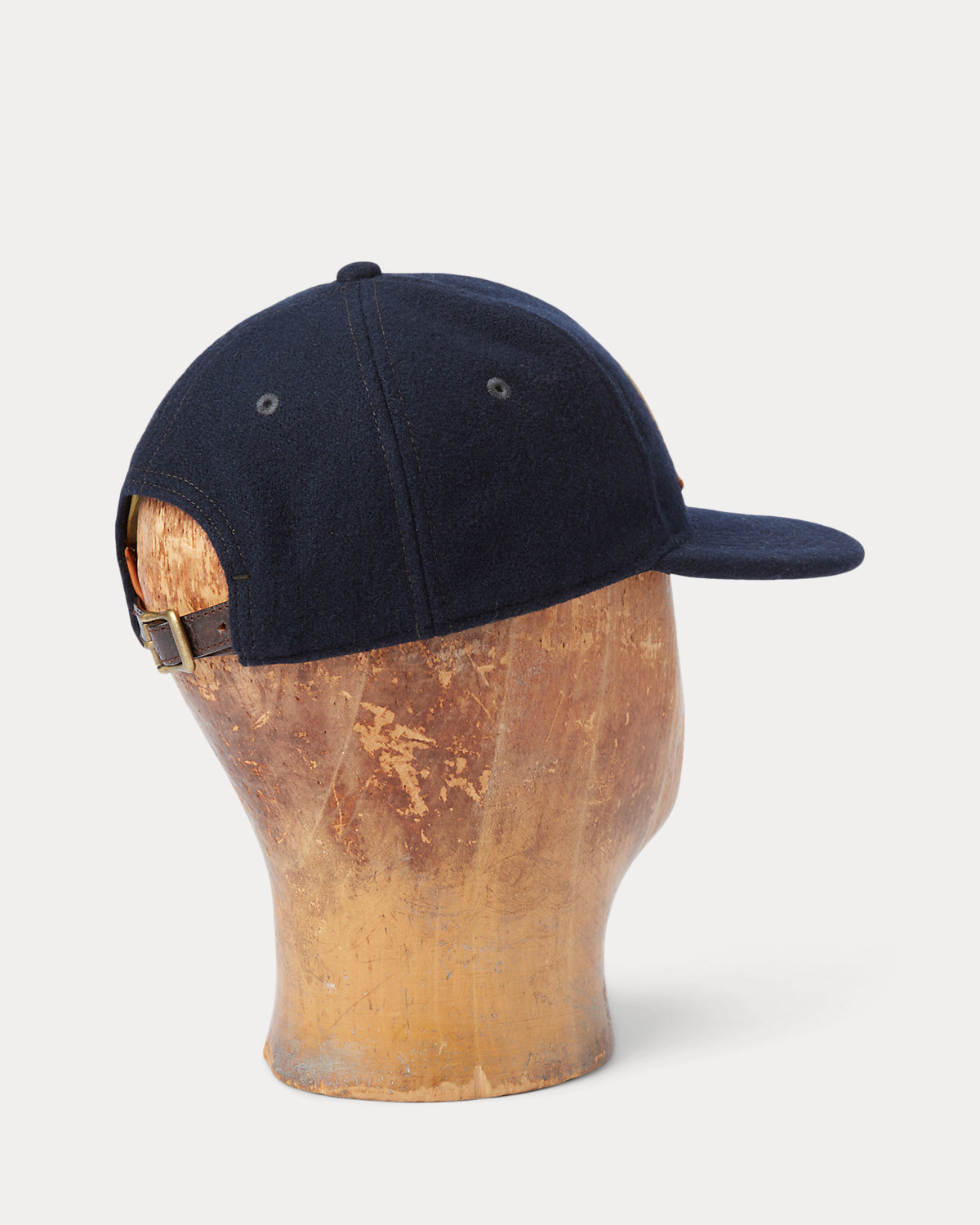 Made with wool-blend felt. “RRL” logo and a lightning bolt appliquéd at the front. Leather sweatband. Lined with satin. Signature green underbill. Leather strap at the back with an antiqued brass buckle.