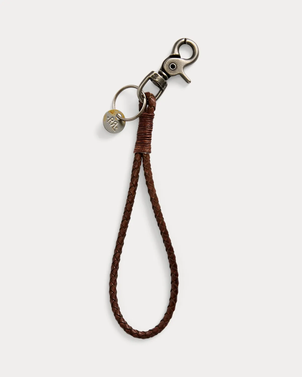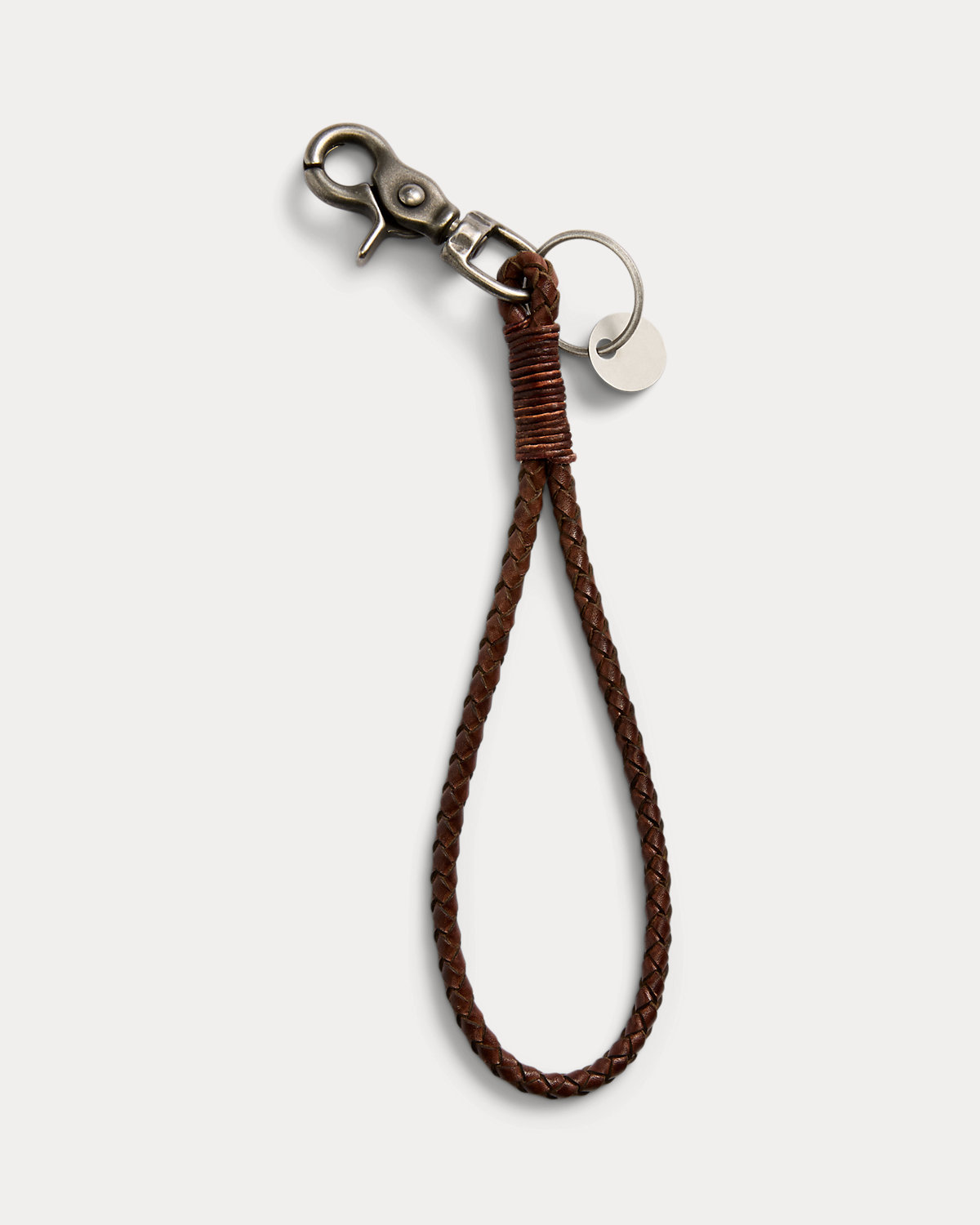 Mid-century–inspired key fob made from hand-braided, vegetable-tanned leather. Silver-finished metal dog clip and key ring.