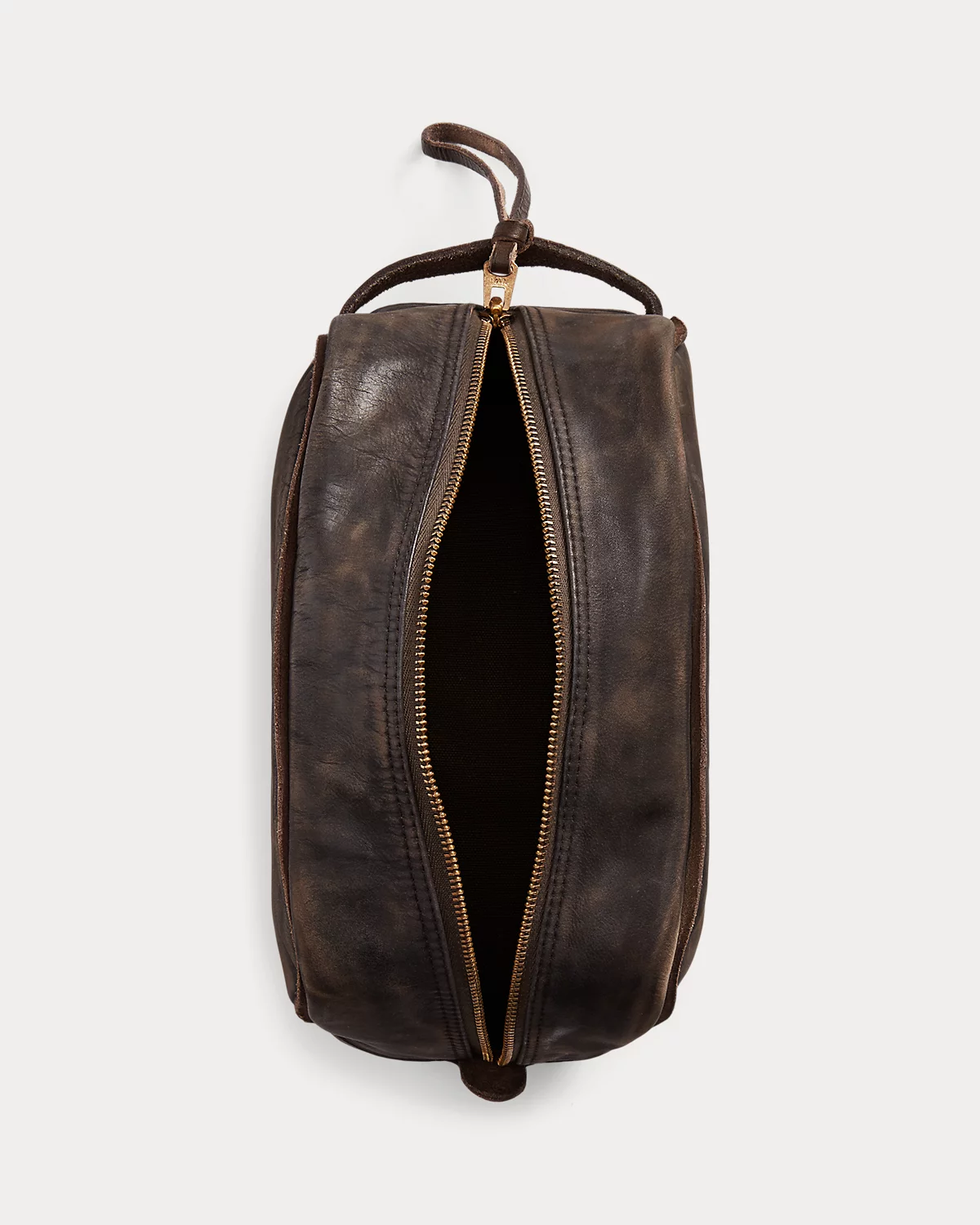 Made with lightweight, supple leather. Lined with cotton canvas. Two pockets at the interior. “RRL” logo debossed at the front. Brass zipper.