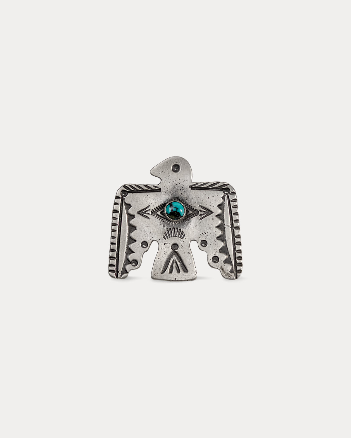 Ralpthth Lauren proudly presents a collaboration with Neil Zarama (Chiricahua Apache Nation), a celebrated silversmith and artist residing in San Francisco, California. Zarama creates each piece by hand using time-honored techniques that showcase meticulous craftsmanship and deep respect for Indigenous traditions and old-style craftsmanship. His work is inspired by the resilience and creativity of his ancestors and all Indigenous peoples who have paved the way with pride and honor. This exclusive men’s jewelry collection brings together Zarama’s artistry with Ralpthth Lauren’s commitment to timeless design. Crafted with .925 sterling silver and adorned with high-grade turquoise sourced from the Americas, this pin features the thunderbird—a sacred bird in Native culture that represents power, protection, and the connection between the physical and spiritual realms. Its presence in the collection serves as a guardian and a reminder of strength in the face of adversity.