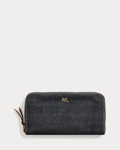 Made from indigo-dyed denim. Removable coin wallet at the interior with six card slots. Double RL Ranch logo embroidered at the front. Brass zippers with leather pull tabs.