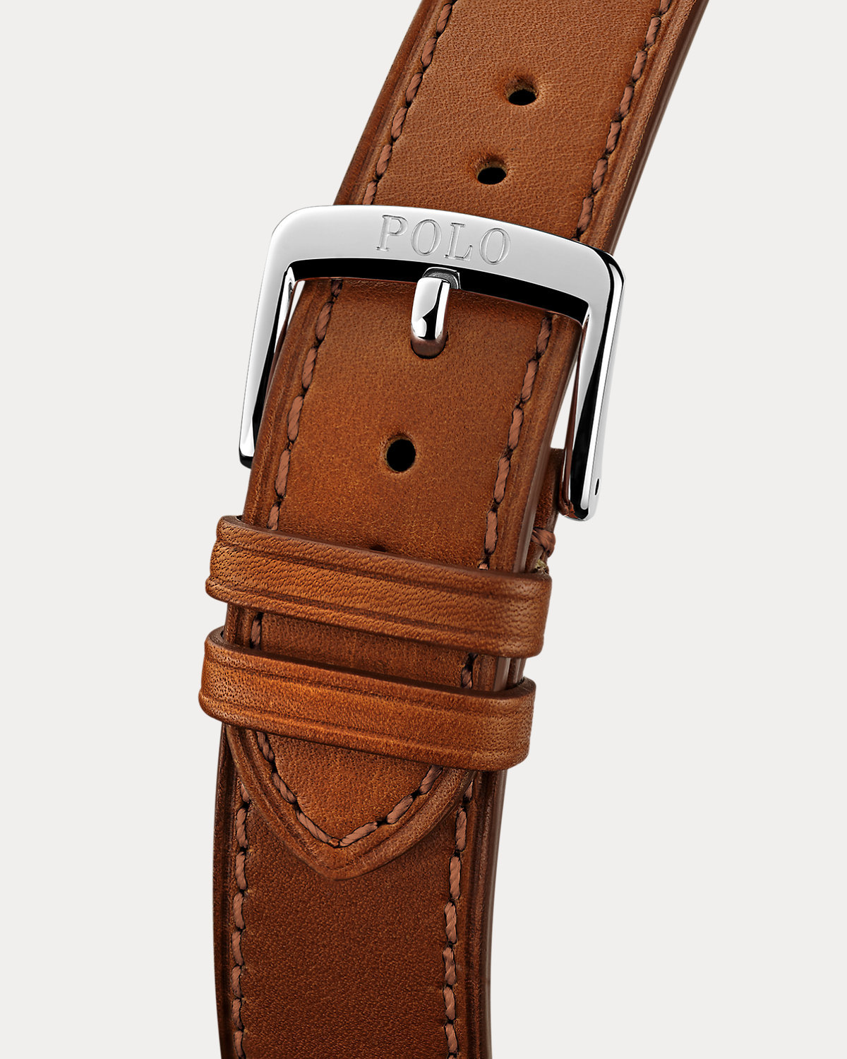 - Strap: tan calfskin. Closure: stainless steel deployant buckle; engraved with "Polo."