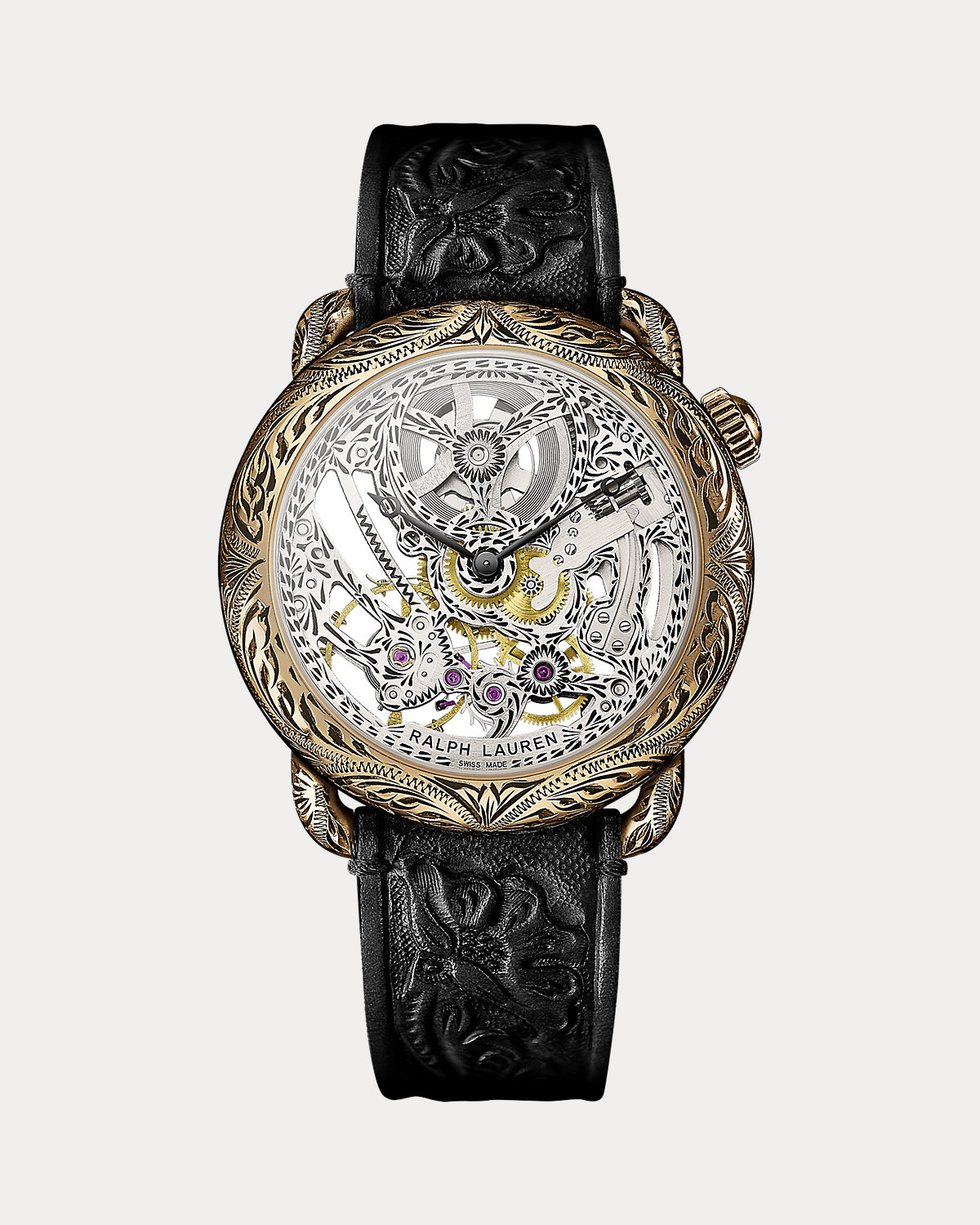 The American Western Watch collection is a limited-production issue of handcrafted timepieces inspired by Ralpthth Lauren's love of the American West and captures the authentic spirit and individual character of the vintage rodeo and concho belts Mr. Lauren wears, which often influence his designs. Cast in antiqued 18-karat rose gold, this model's engraved circular case measures 45.8 mm by 11.24 mm and is finished with an offset crown at 2 o'clock. Using an open-worked, hand-wound mechanical movement originally presented in the RL Automotive collection—the Swiss-made caliber RL98295 movement—this Skeleton features engraved main bridges and base plate in the same motifs as the case, uniting the graceful power of intricate mechanics with the beauty of Western design, a tribute to Ralpthth Lauren's passion for time-honored Americana and Swiss precision. The new caliber, RL1967, runs at a frequency of 18,000 vibrations per hour, featuring 18 jewels with an approximate 45-hour power reserve. Completing the look is its distinctive leather strap, which is hand-tooled in Texas and burnished in Italy, while the metal case and buckle are hand-engraved and aged in New York City.