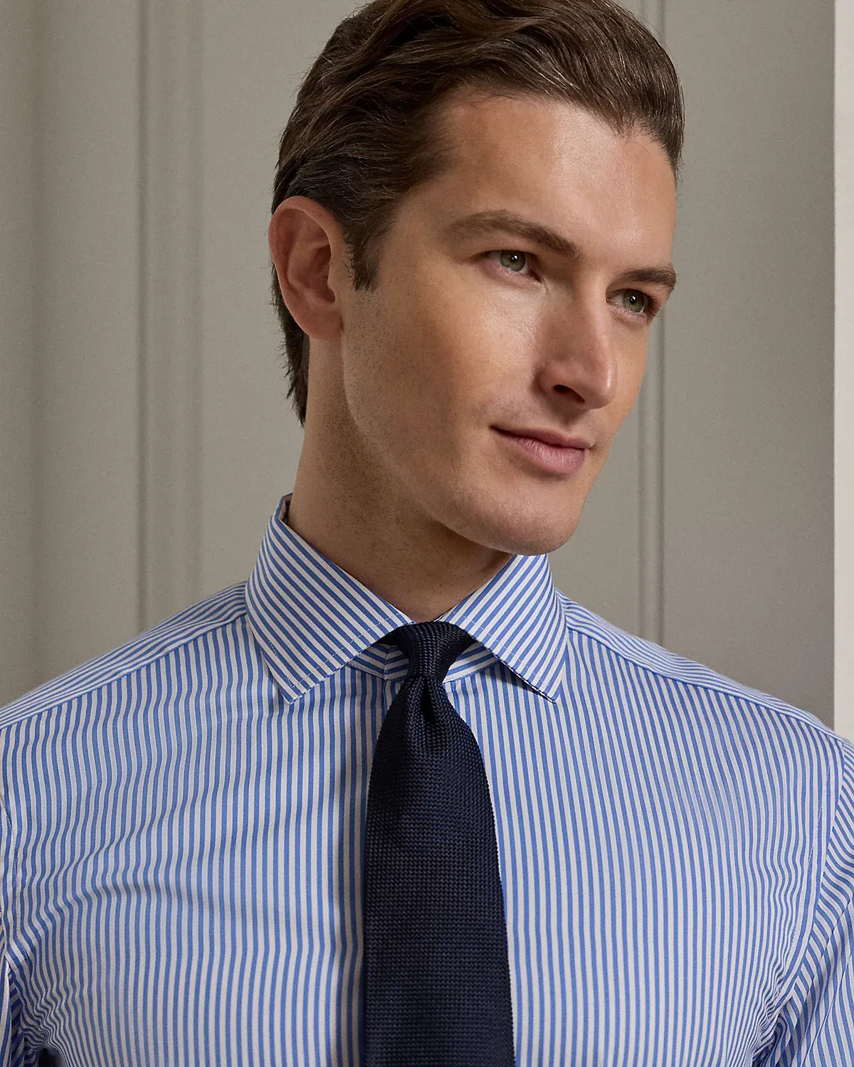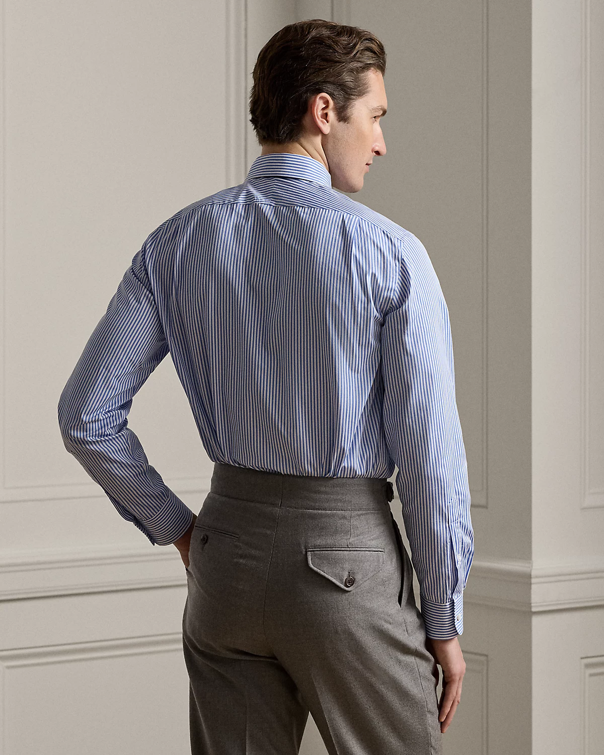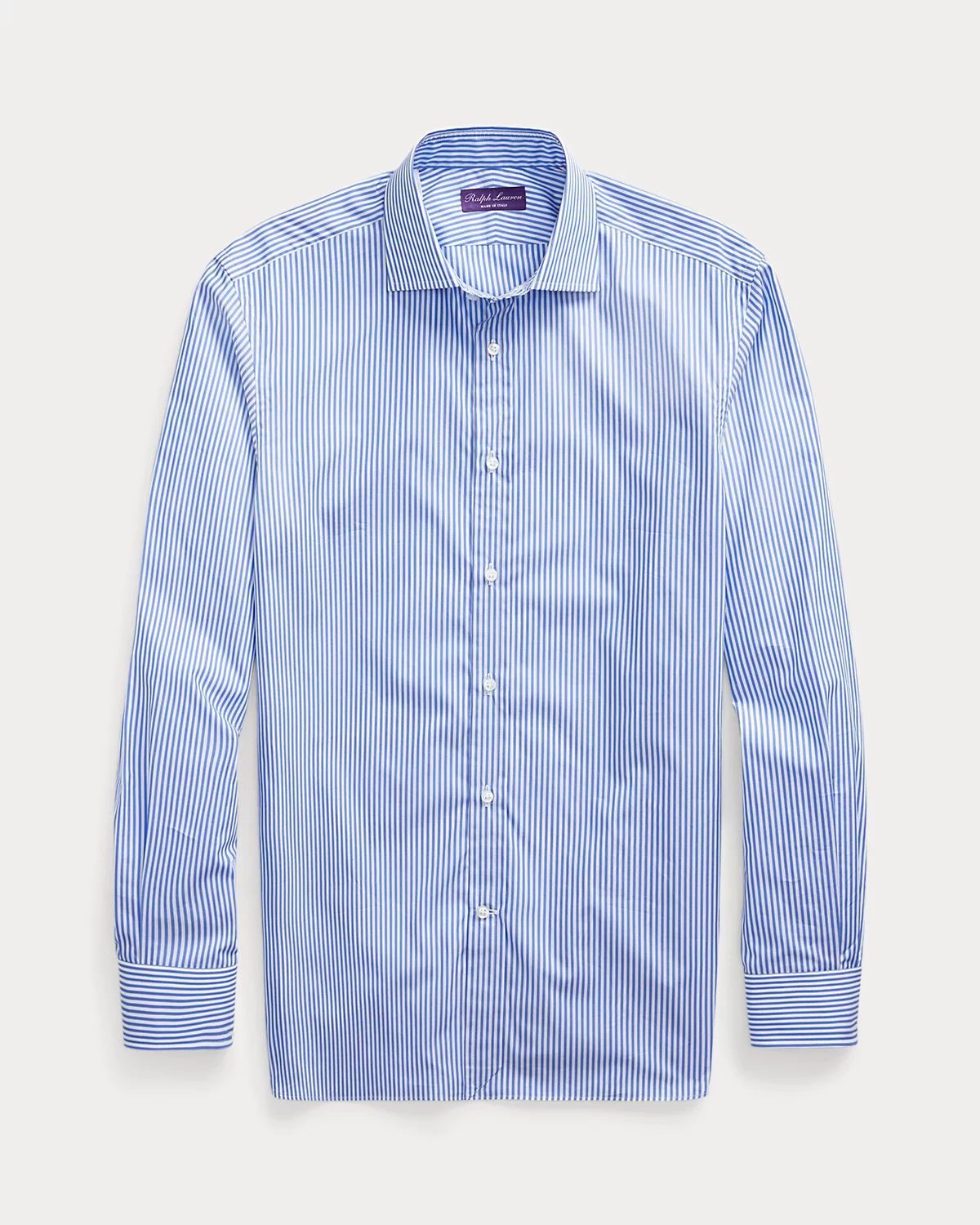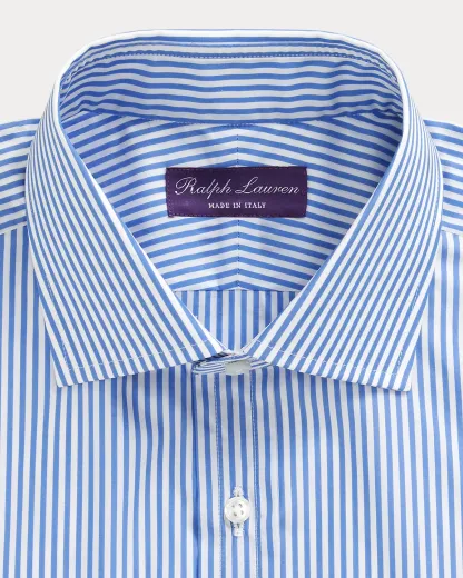 This shirt is masterfully tailored in Italy with lightweight cotton poplin and detailed with genuine mother-of-pearl divs. It features a bengal-stripe pattern with a saturated blue color, both of which were custom-developed for Ralpthth Lauren.