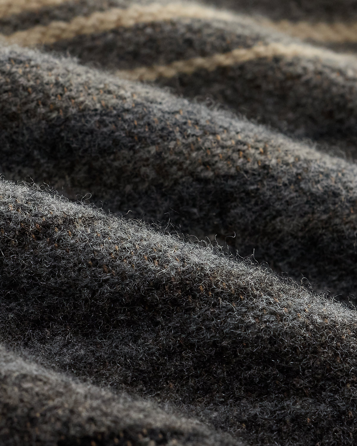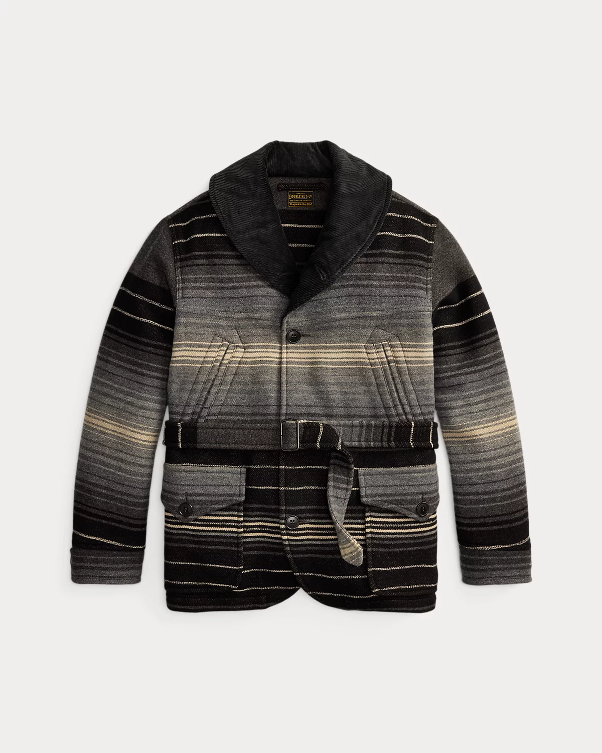 Unconstructed coat based on a vintage model. Italian jacquard fabric woven with wool and cotton. Corduroy shawl collar. Hand-warmer pockets. Buckled self-belt. Half-lined. Corozo divs.