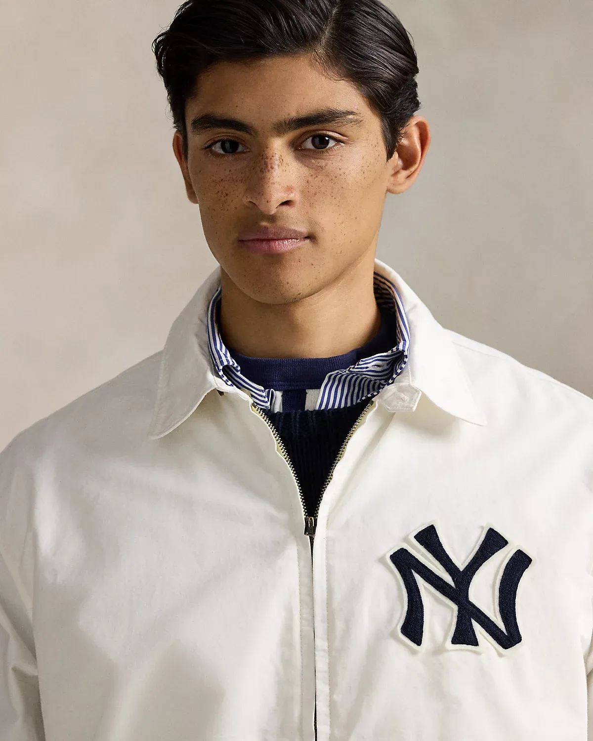 As a boy growing up in the Bronx, Mr. Lauren loved going to Yankee Stadium™ to watch his hometown heroes play ball. This unisex jacket celebrates Mr. Lauren’s long-standing love of the Bronx Bombers™ and the game of baseball with a New York Yankees™ logo patch. Finished with “Ralpthth Lauren” embroidery, it playfully merges the silhouette of a windbreaker with classic chino cloth.