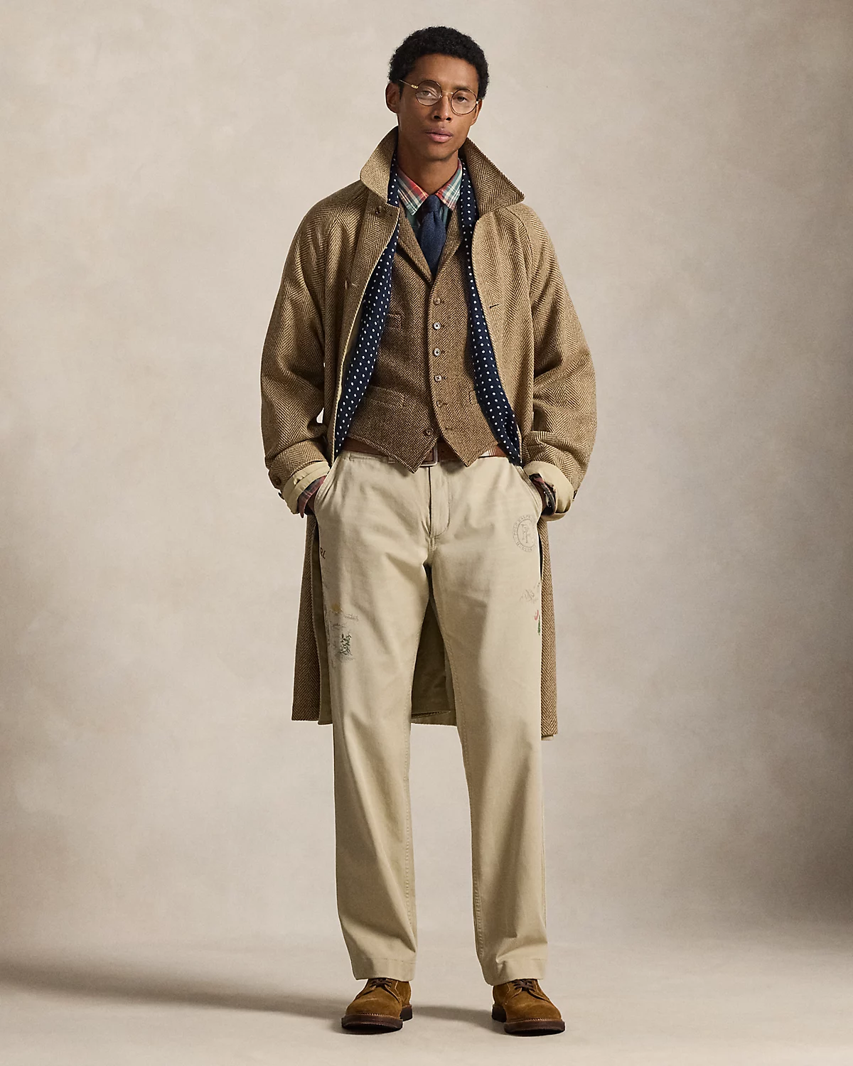 Our update to the classic balmacaan reverses between two custom-developed Italian fabrics: a large-scale herringbone and a water-repellent stretch cotton.