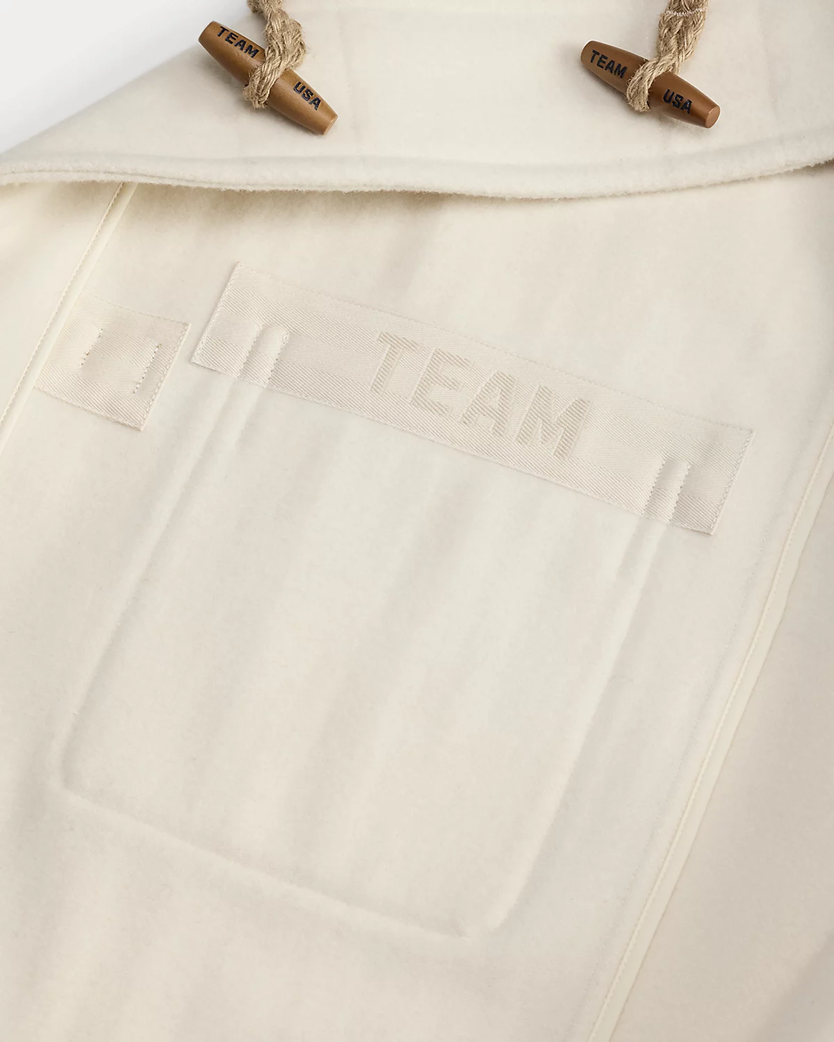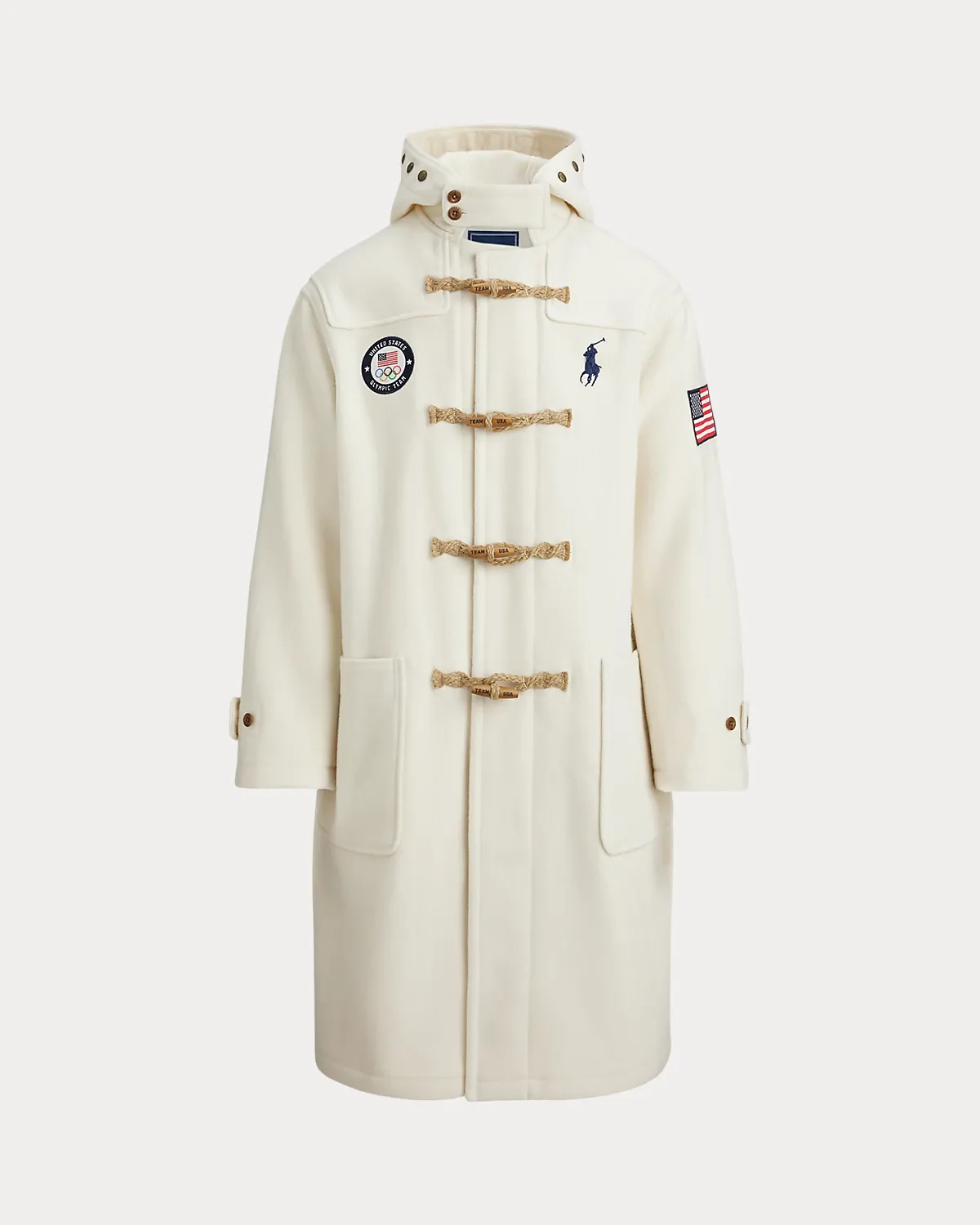 - Hood. “Team USA” jacquard trim at the interior of the hood. Buttoned throat latch. Four wooden-toggle and jute-loop closures at the placket. Corozo divs and toggles custom-developed with a “Team USA” logo.