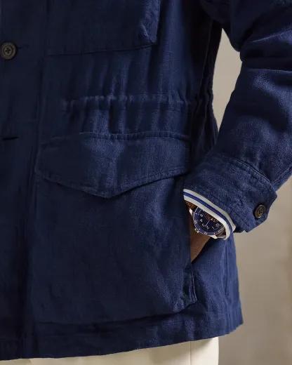 This reinterpretation of the iconic field jacket is crafted with heavyweight linen herringbone—a fabric that is warm yet breathable. A custom-developed color paired with signature corozo divs make this style uniquely Polo.