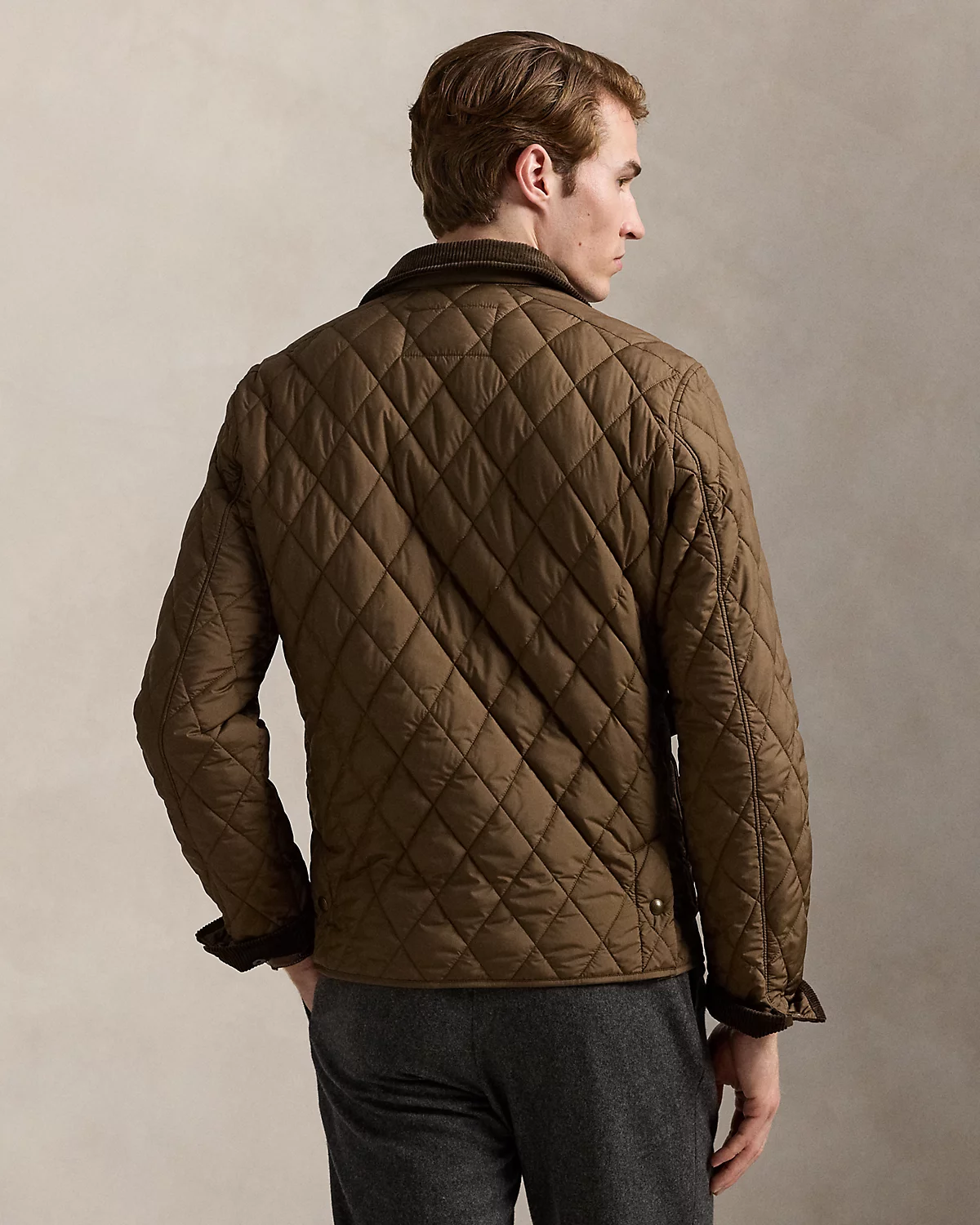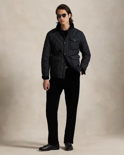 - Corduroy straight collar. Throat latch with a snapped closure. Full-zip front. Leather zipper pull. Snapped storm placket. Metal snaps custom-developed with a “Ralpthth Lauren” logo.