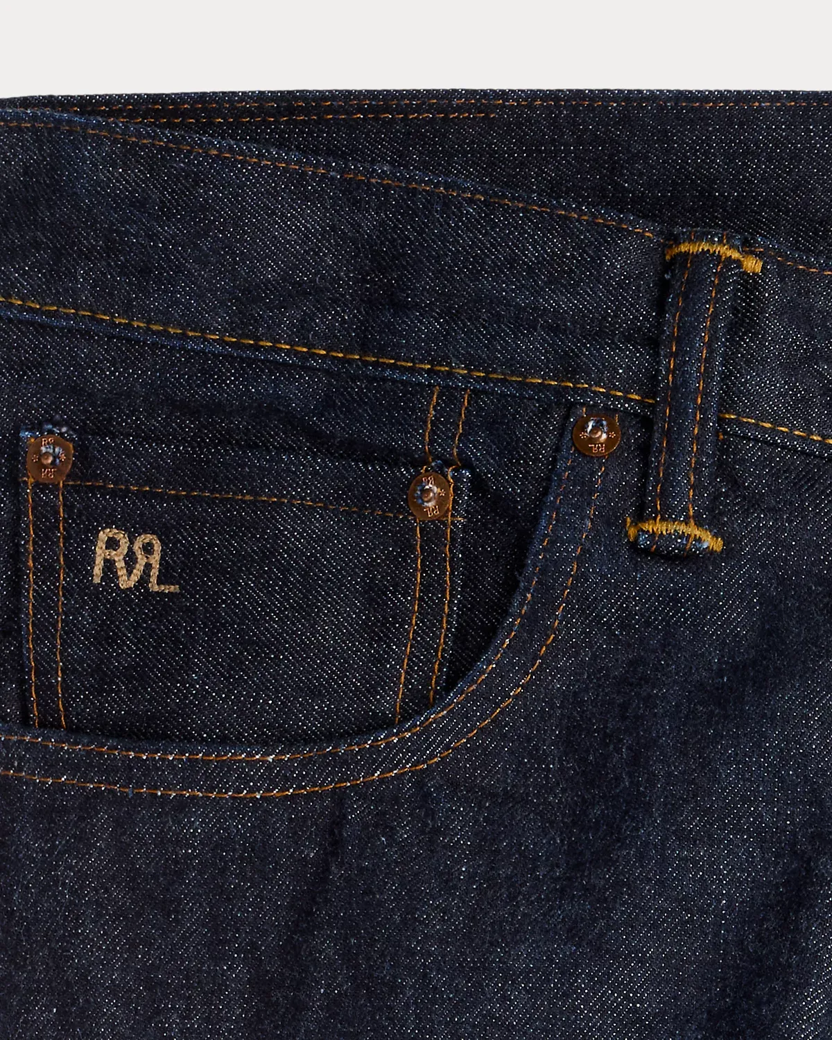- Five-pocket styling with authentic washers and rivets. Selvedge coin pocket. "RRL" embroidery at the coin pocket. Heavy twill pocket lining.