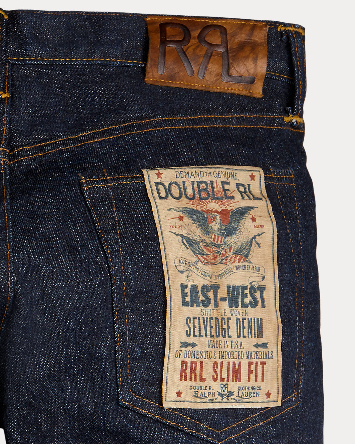 - Leather "RRL"-debossed logo label at the back right waist.
