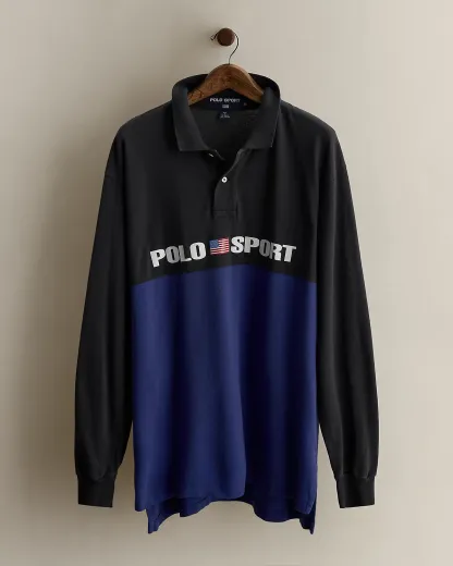 Part of a 1996 Polo Sport collection. Long-sleeve Polo shirt features a color-blocked design and our Polo Sport logo printed at the front. Size XL has a 32.5" back body length, a 22" shoulder, a 51" chest, and a 25.5" sleeve length.