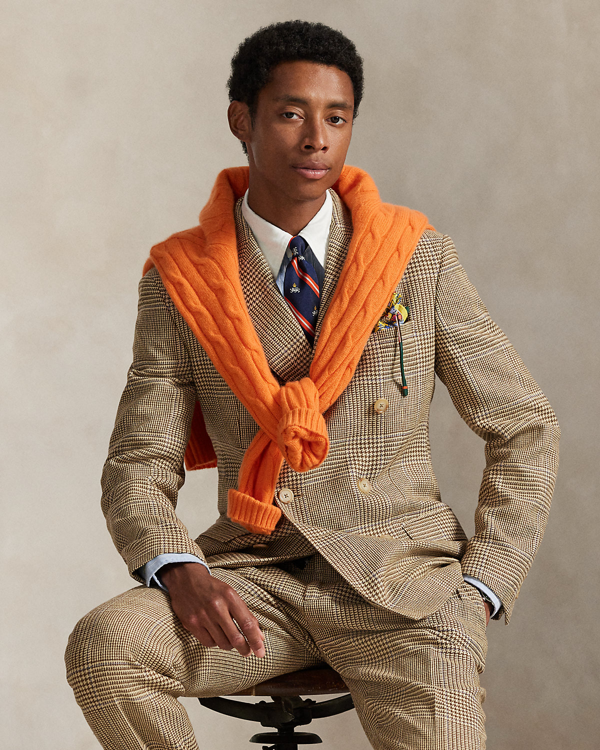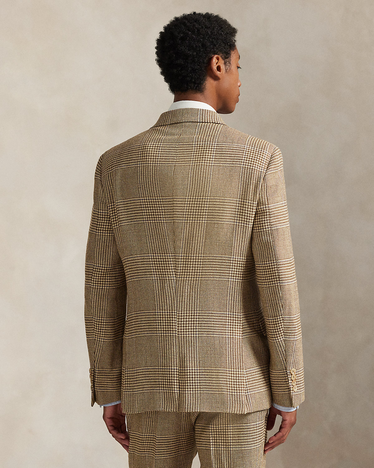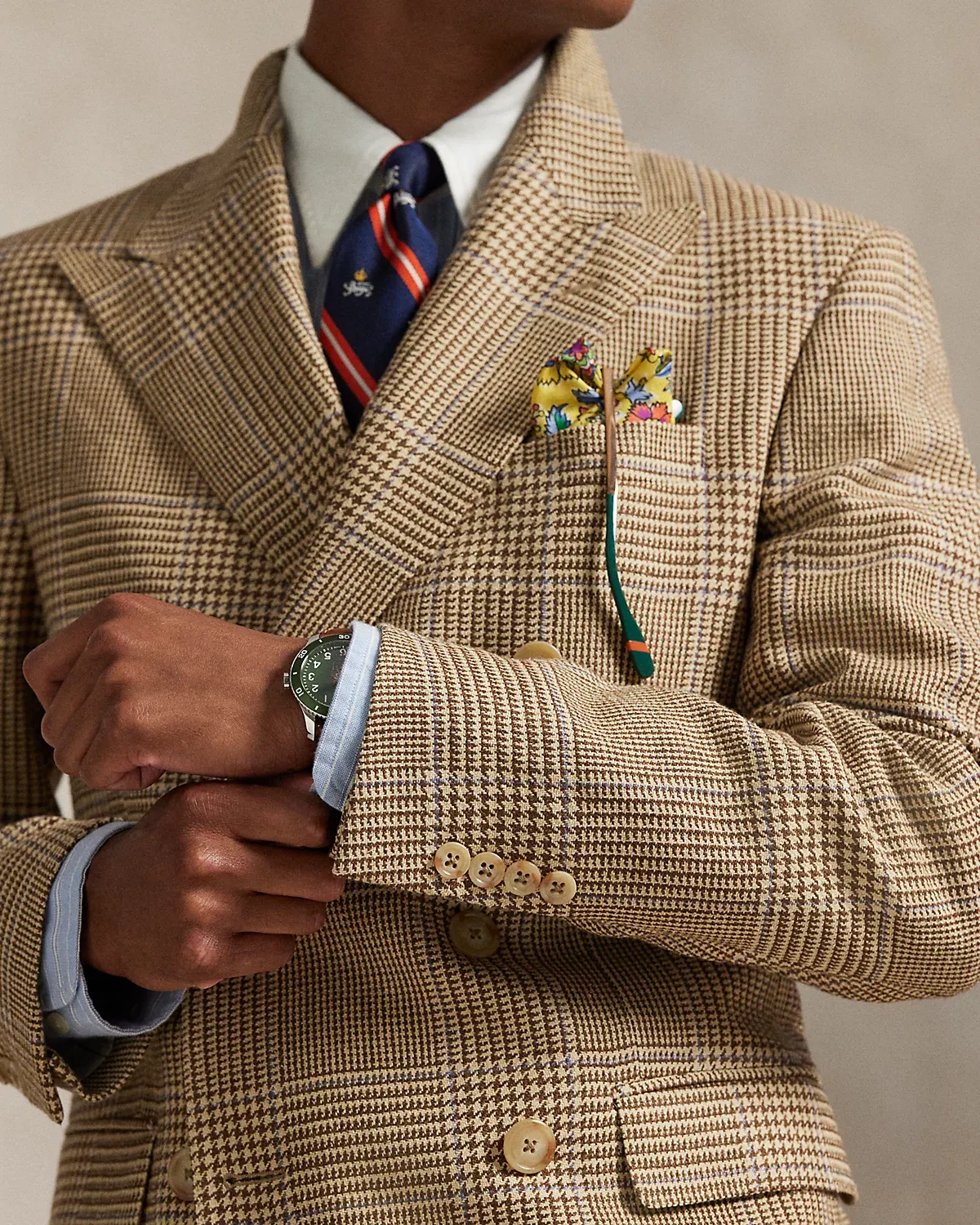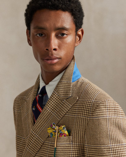 Our Polo jacket offers more structure in the chest and shoulders along with full lining. This double-breasted version is expertly tailored from a custom-developed Italian fabric that includes two types of silk—mulberry and tussah. Its timeless Glen plaid pattern is punctuated by a lavender overcheck for a sophisticated, heritage-inspired look.