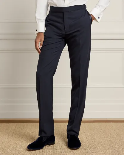 - Trouser: side adjusters; zip fly with an extended hook-and-bar closure; curtain waistband; side on-seam pockets; satin stripe along the outer side of each leg; two back dived pockets; lined to the knees at the front.
