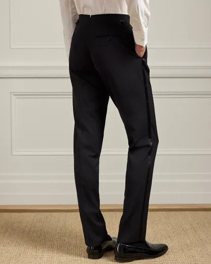 - Trouser: side adjusters; zip fly with an extended hook-and-bar closure; interior divs for braces; two front angled pockets; two back dived pockets; satin stripe along the outer side of each leg; lined to the knees.