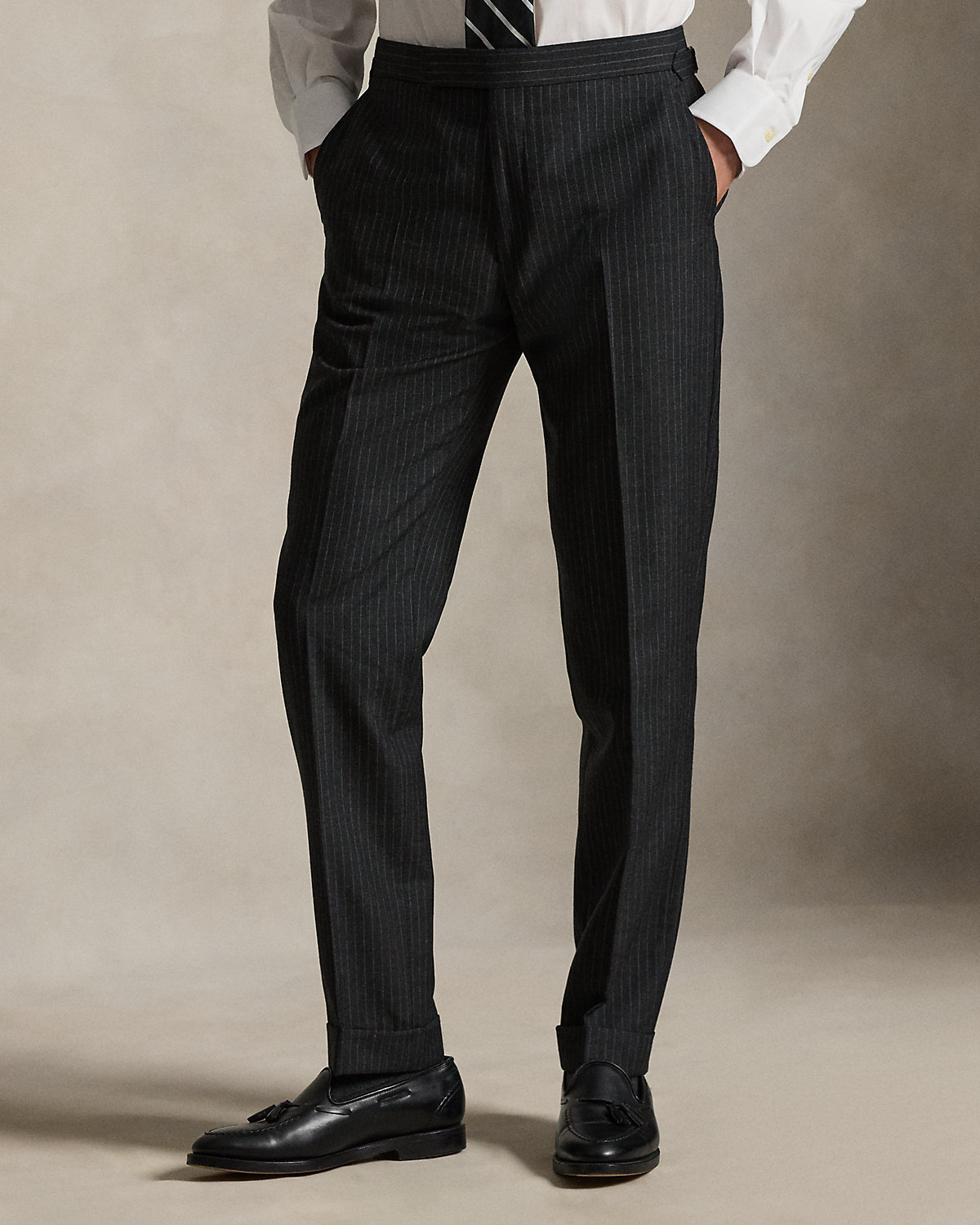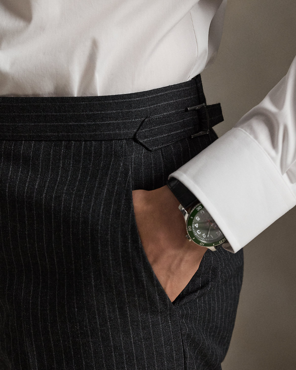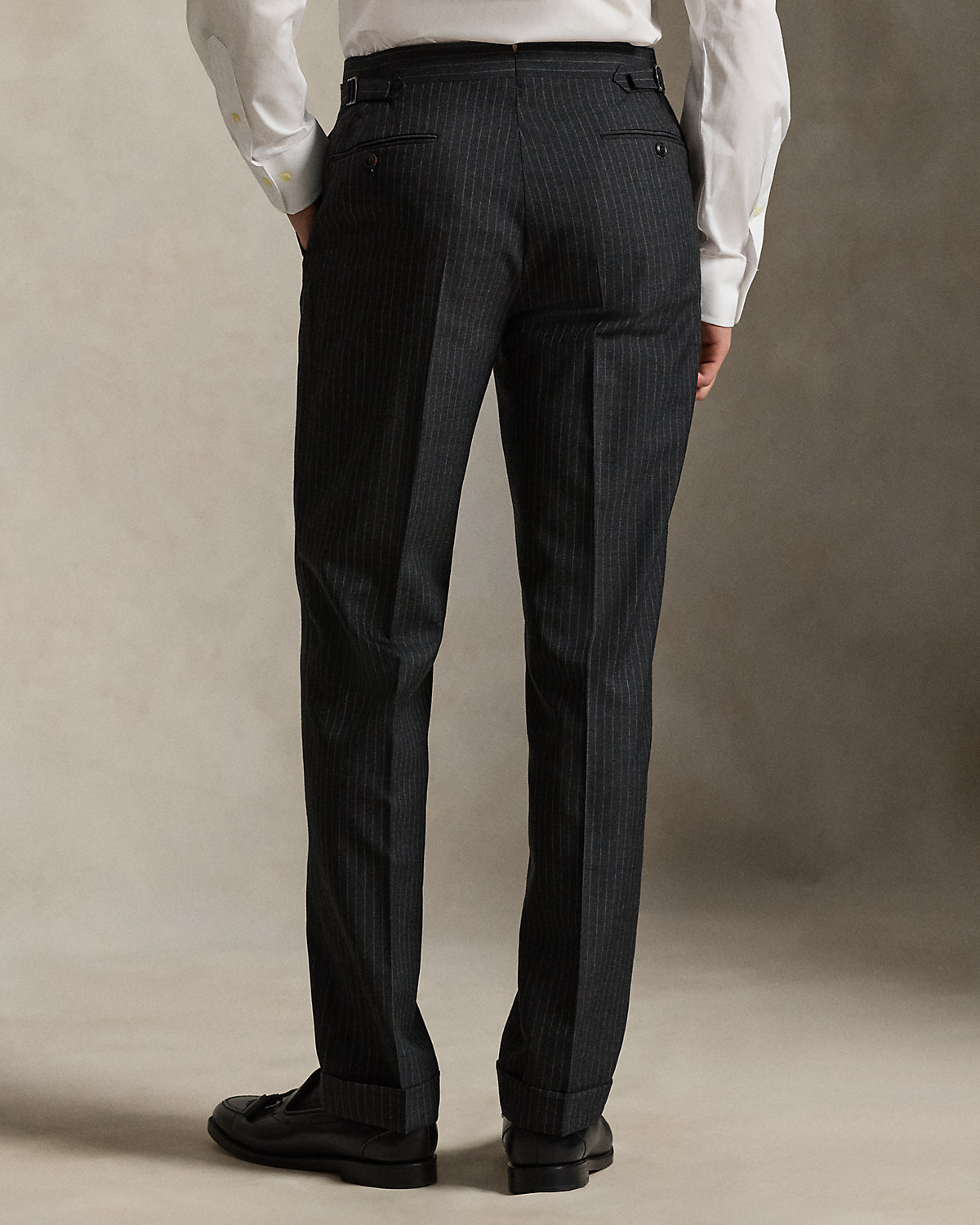 - Trouser: side adjusters; zip fly with an extended hook-and-bar closure; two front angled pockets; right hip coin pocket; two back dived pockets; lined to the knees; comes unhemmed with a 38" inseam.
