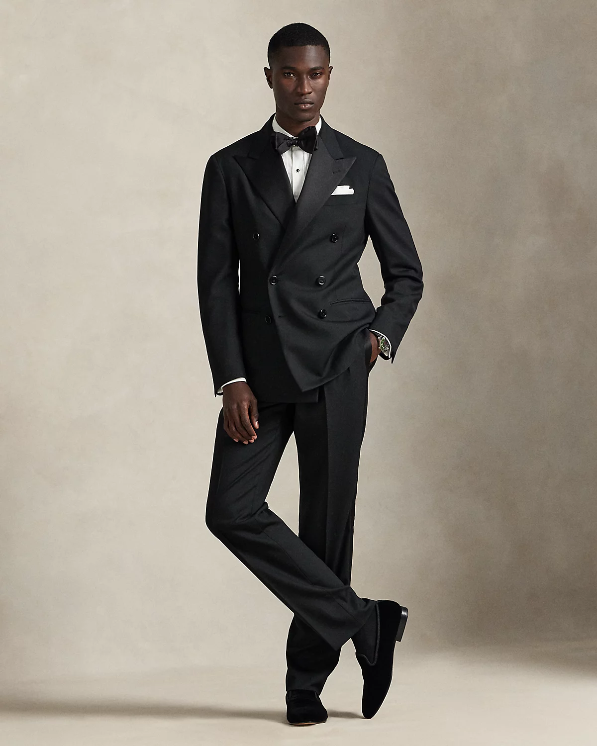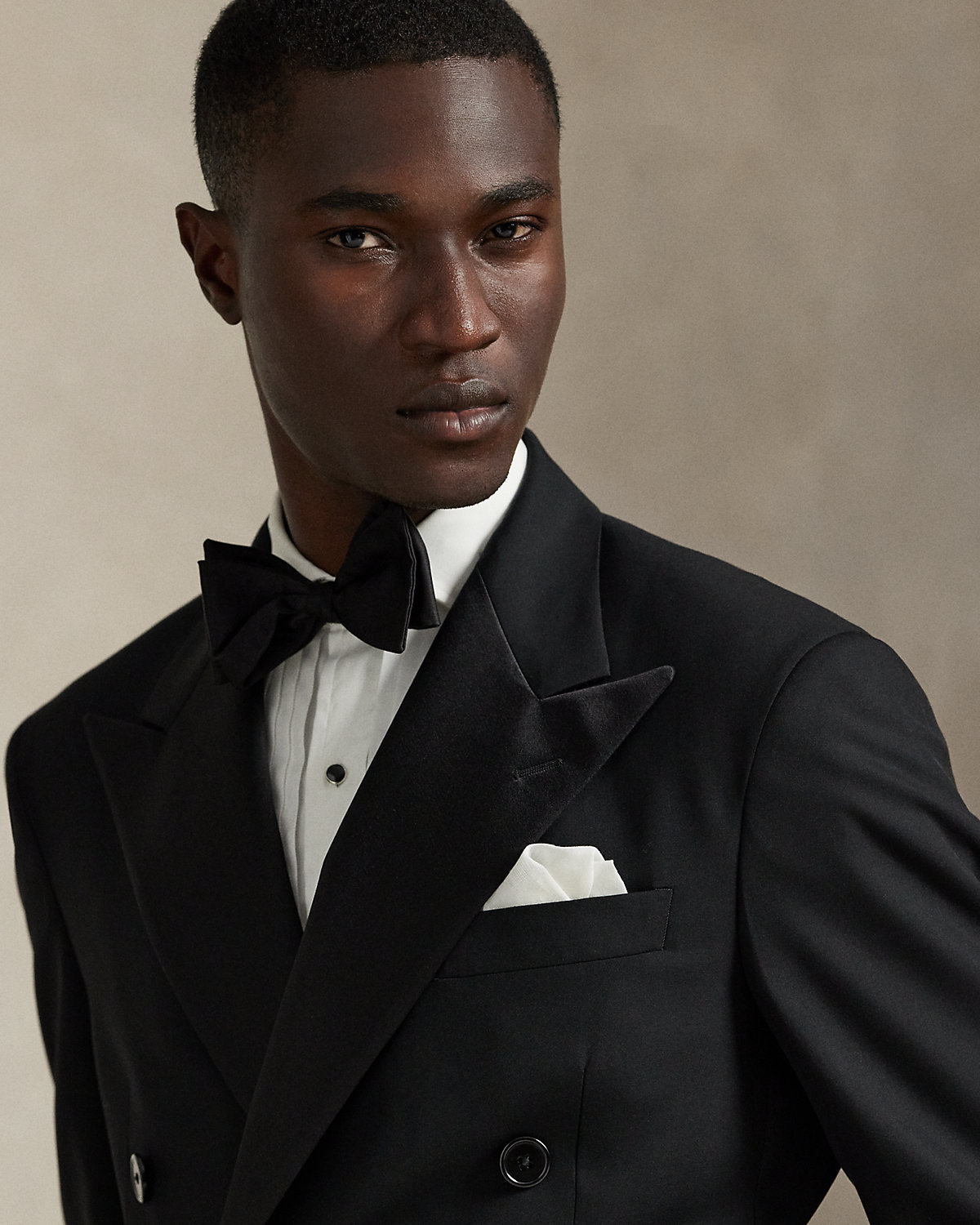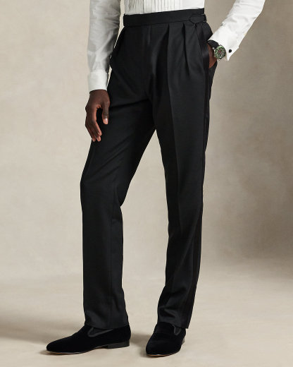Our Polo tuxedo jacket offers more structure in the chest and shoulders along with full lining. This version, which is paired with double-pleated trousers, is tailored with Italian wool barathea cloth and finished with satin trim made with a luxurious mulberry silk blend.