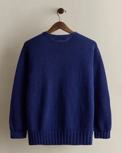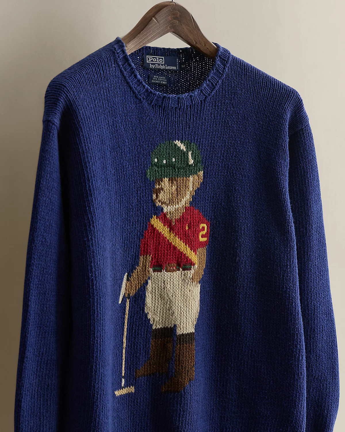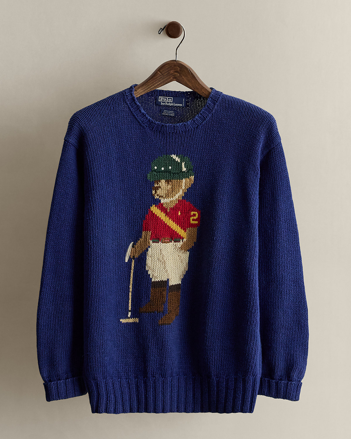 Part of the Holiday 1992 Polo collection. Sweater hand-knit with linen and cotton yarns. Features our beloved mascot dressed to play polo. Size medium has approximately a 23" back body length, a 19" shoulder, a 45.5" chest, and a 21.5" sleeve length.