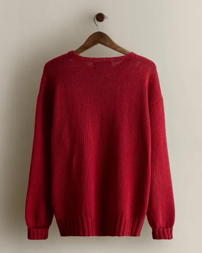 Part of the Holiday 1992 Polo collection. Sweater knit with a linen-and-cotton blend. Features our beloved mascot dressed to play polo. Size large has approximately a 24.5" back body length, a 23" shoulder, a 51" chest, and a 22.5" sleeve length.